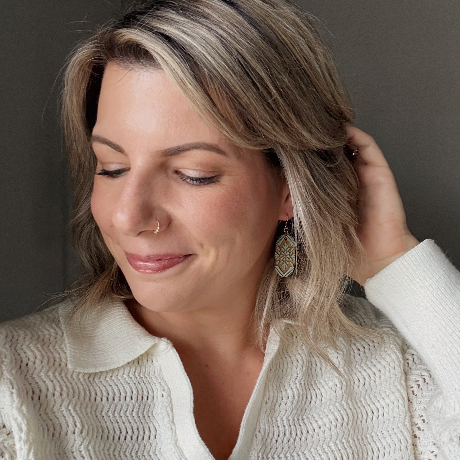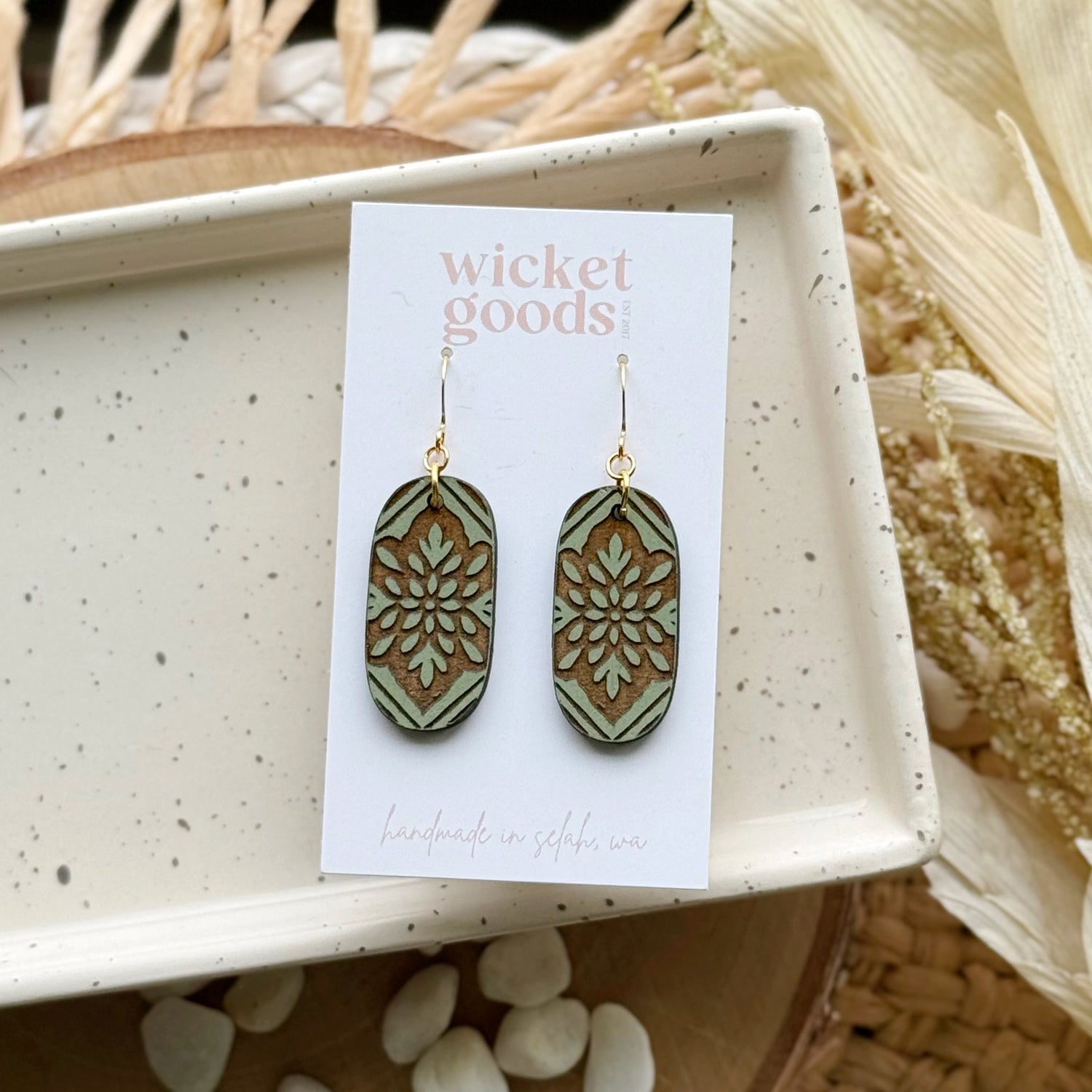 Made from hand painted Baltic Birch wood and hypoallergenic gold-plated brass ear wires. Designed, cut, and assembled in our home studio in Selah, Washington.