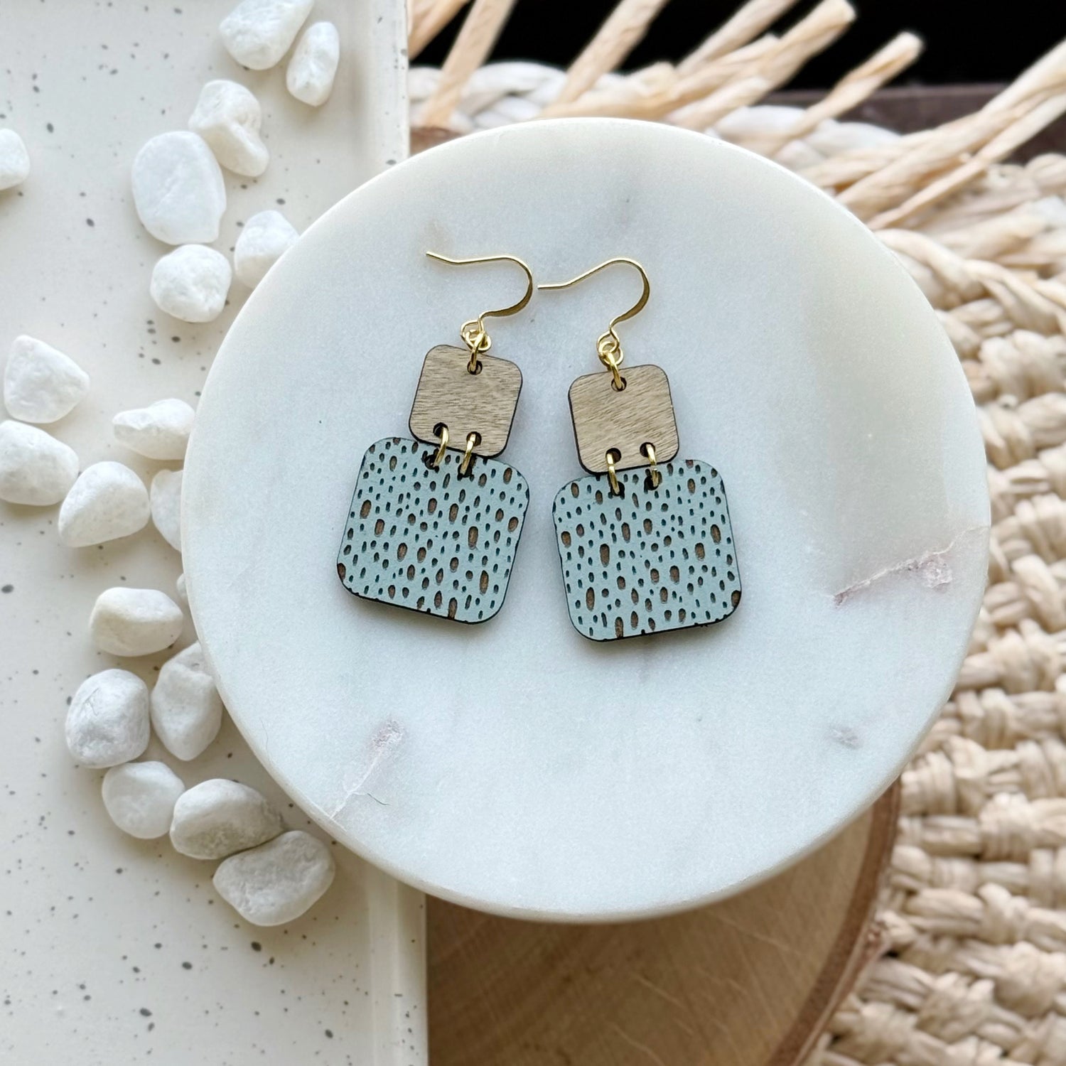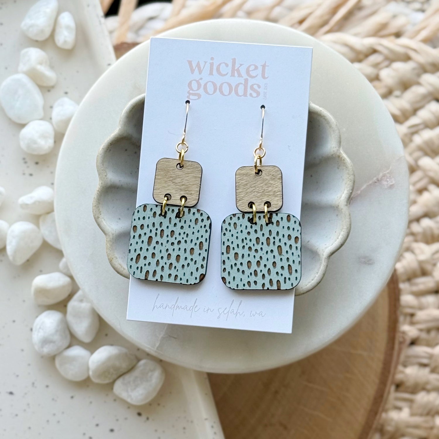 Made from hand painted Baltic Birch wood and hypoallergenic gold-plated brass ear wires. Designed, cut, and assembled in our home studio in Selah, Washington.