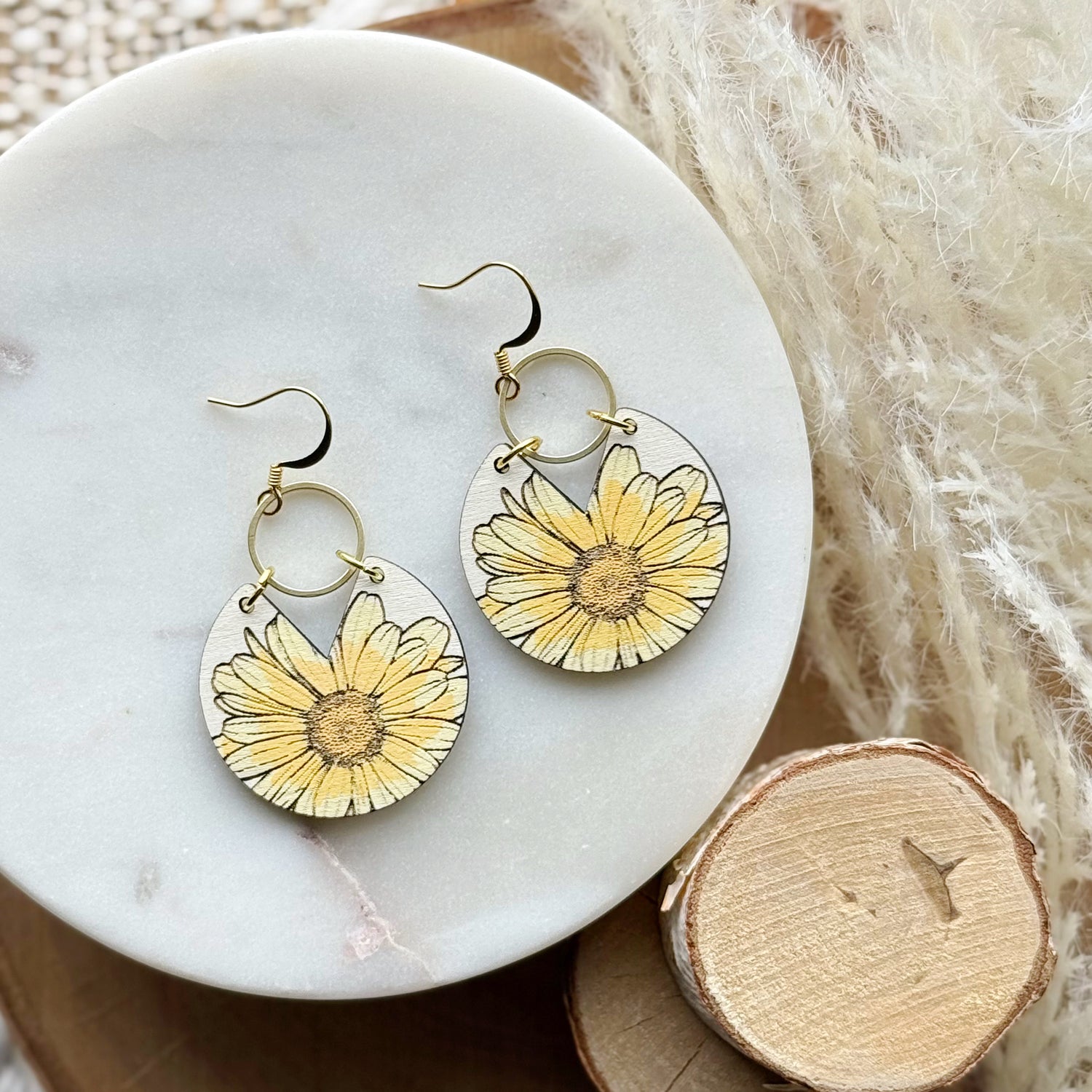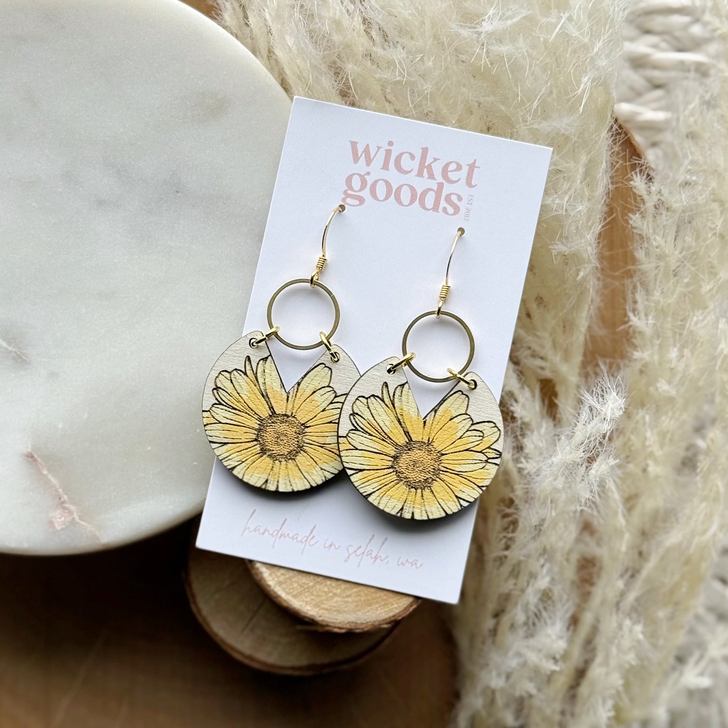 Made from hand painted Baltic Birch wood, raw brass, and hypoallergenic gold-plated brass ear wires. Designed, cut, and assembled in our home studio in Selah, Washington.