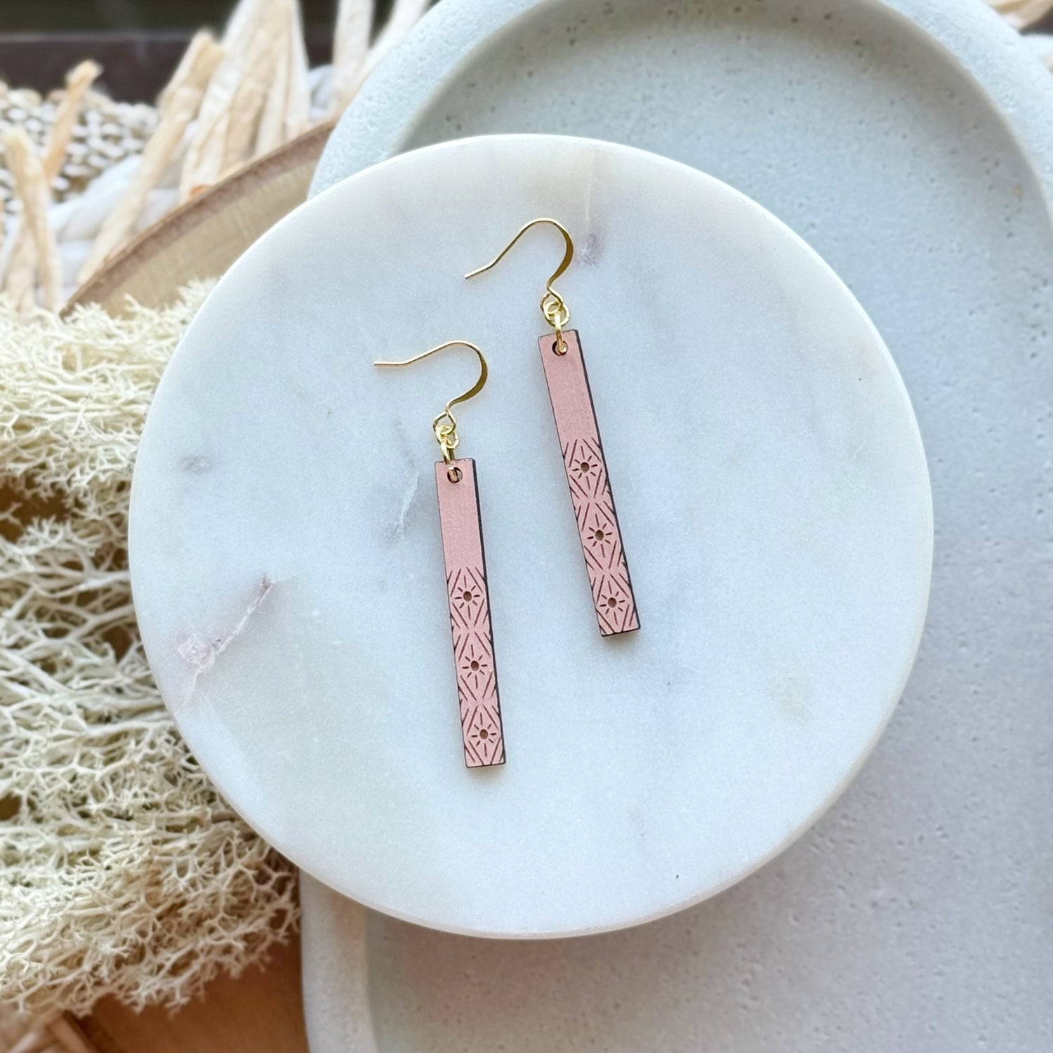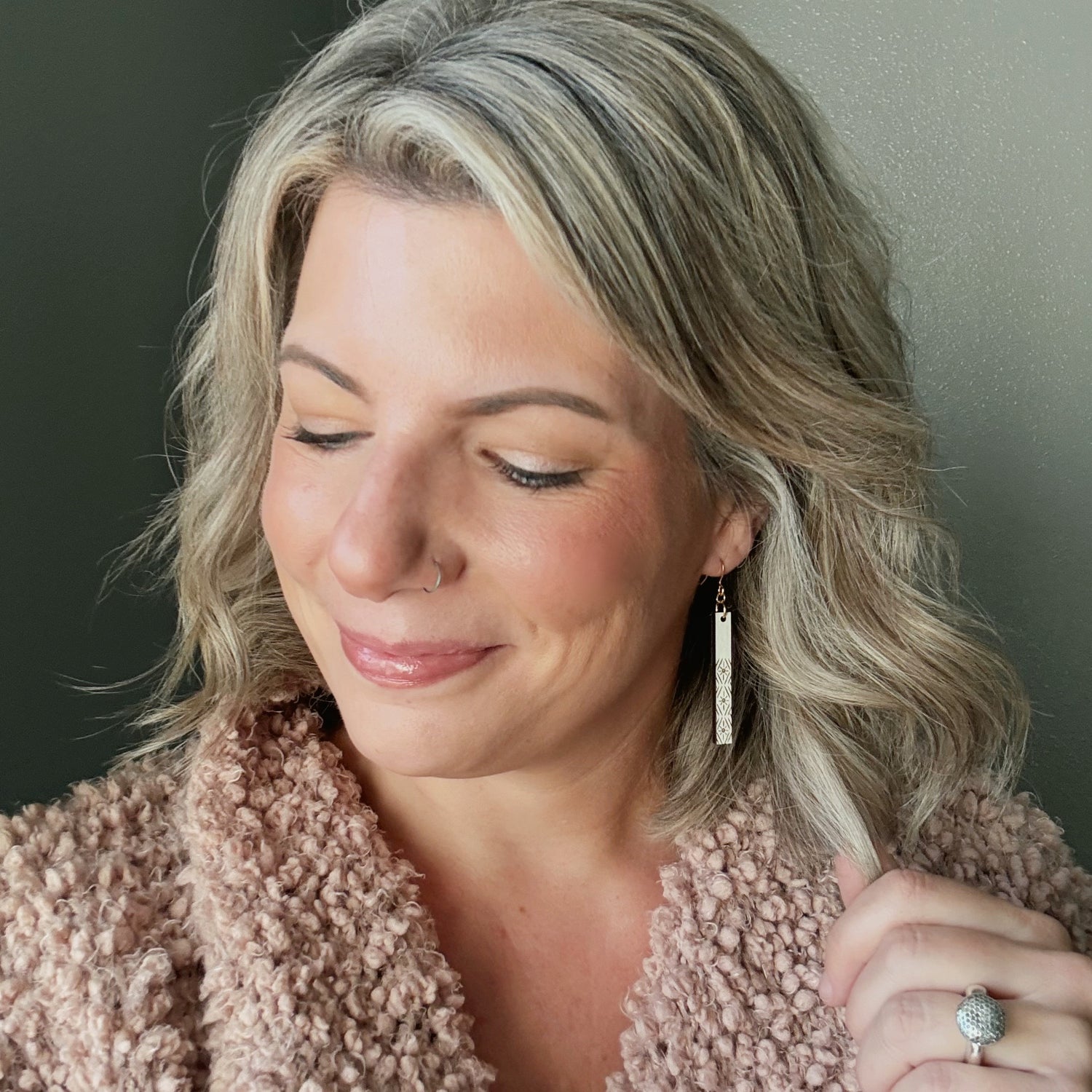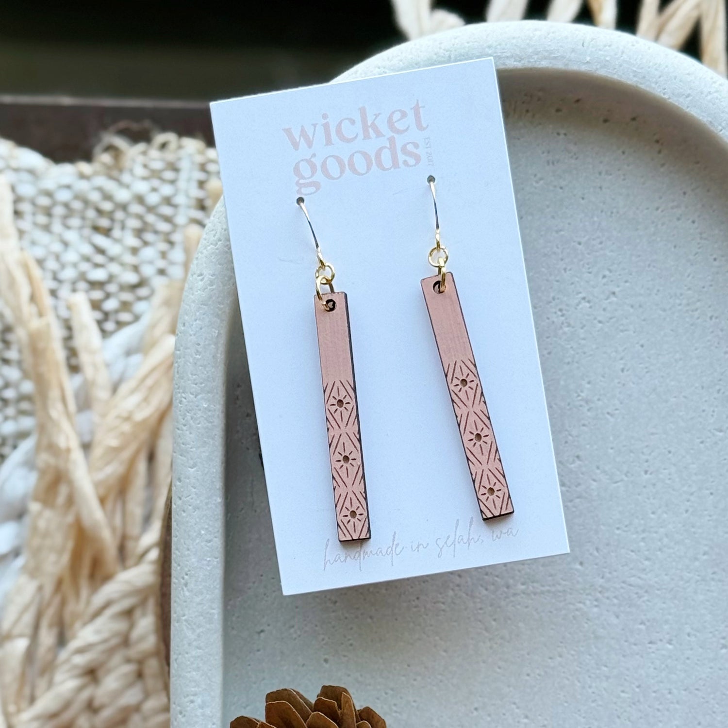 Made from hand painted Baltic Birch wood and hypoallergenic gold-plated brass ear wires. Designed, cut, and assembled in our home studio in Selah, Washington.
