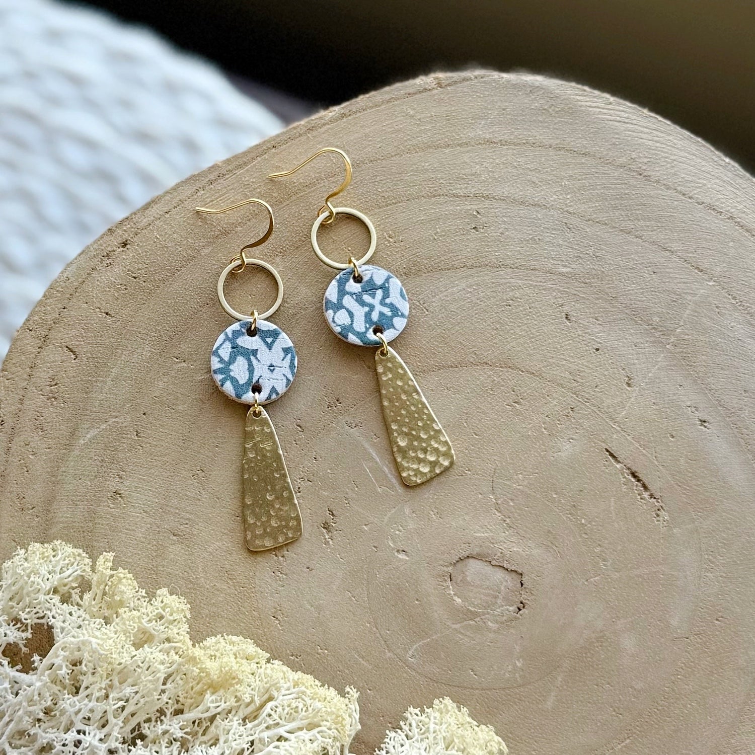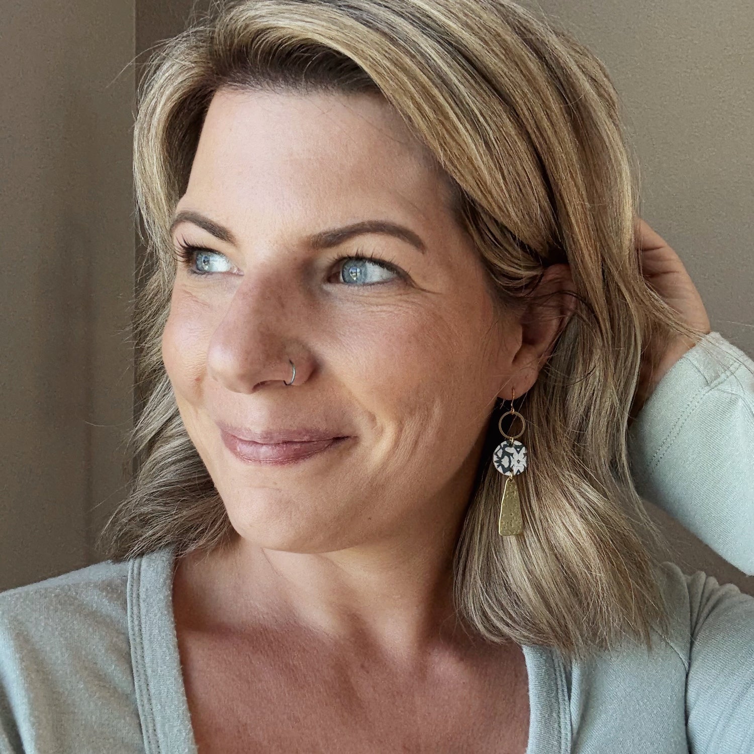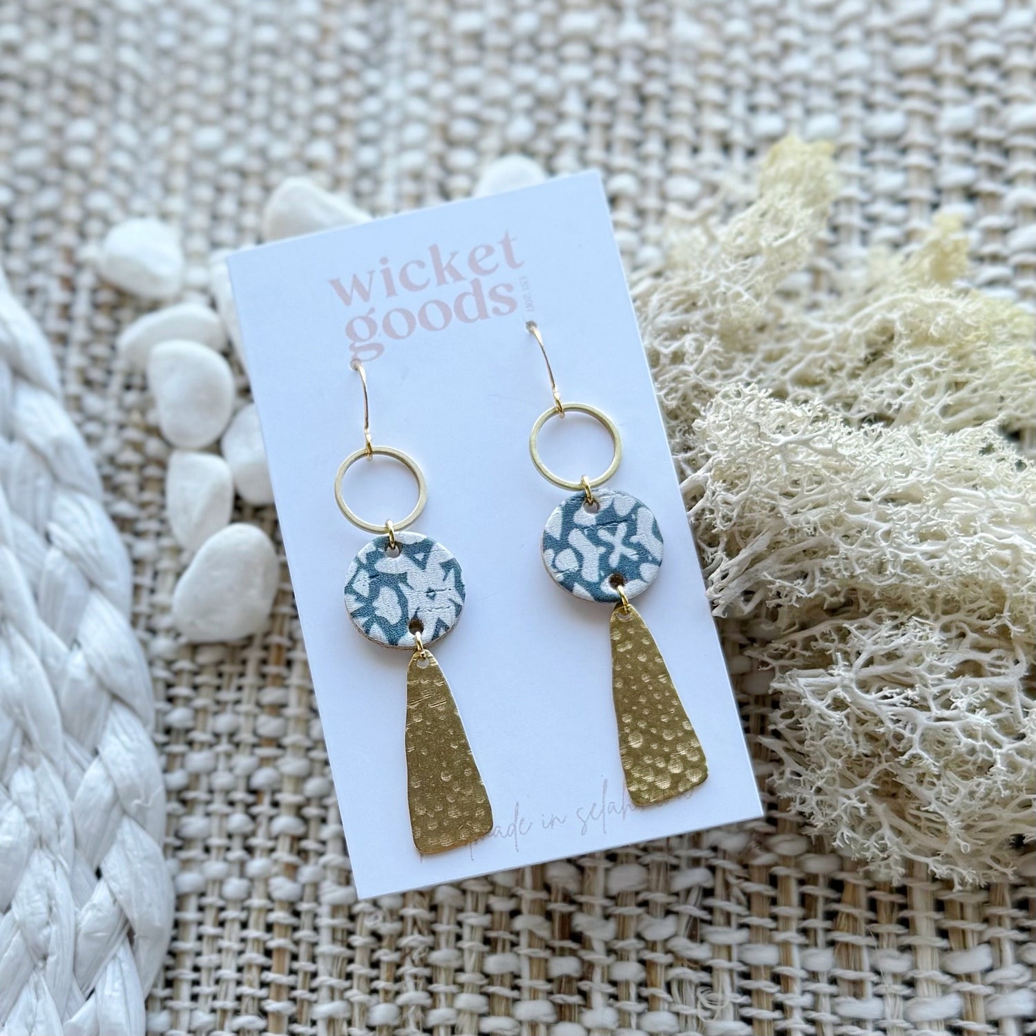 Made from cork backed with genuine leather, raw brass, and hypoallergenic gold plated brass ear wires. Designed, cut, and assembled in our home studio in Selah, Washington.