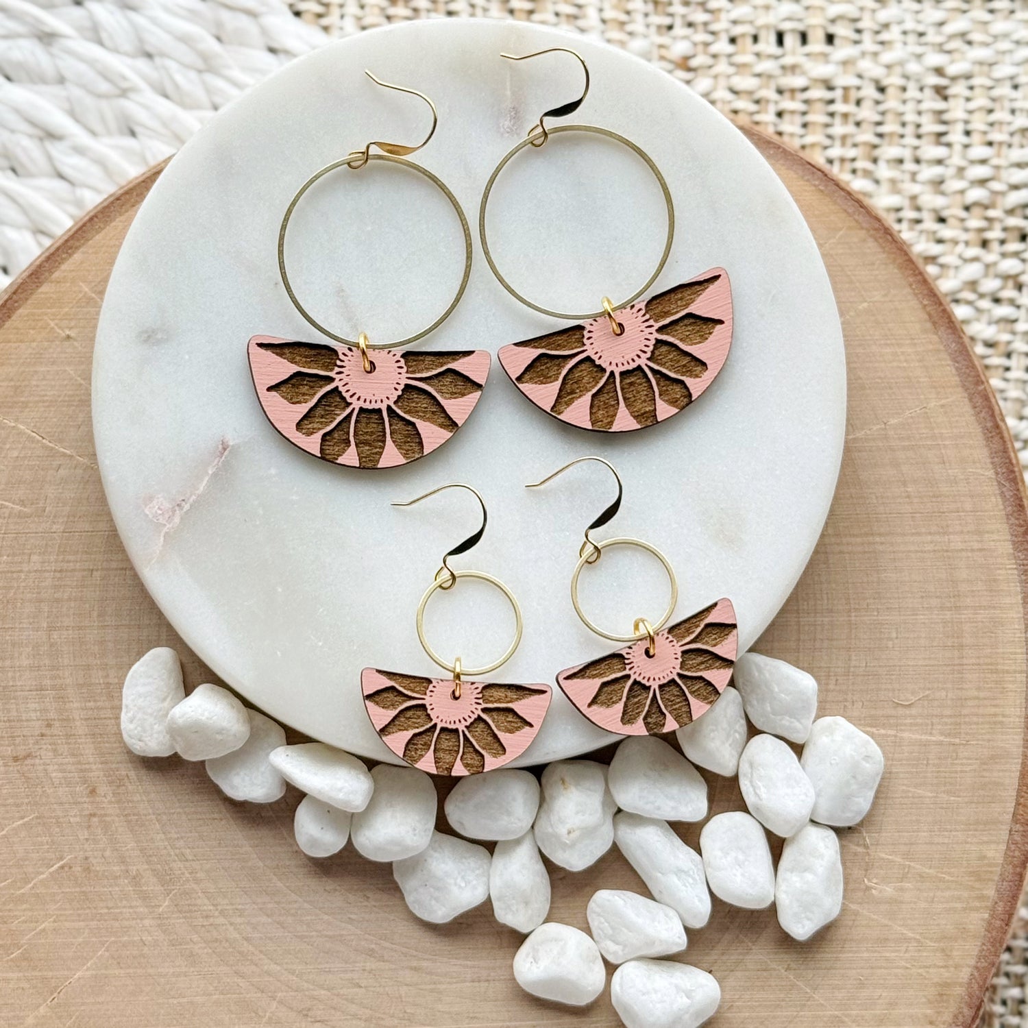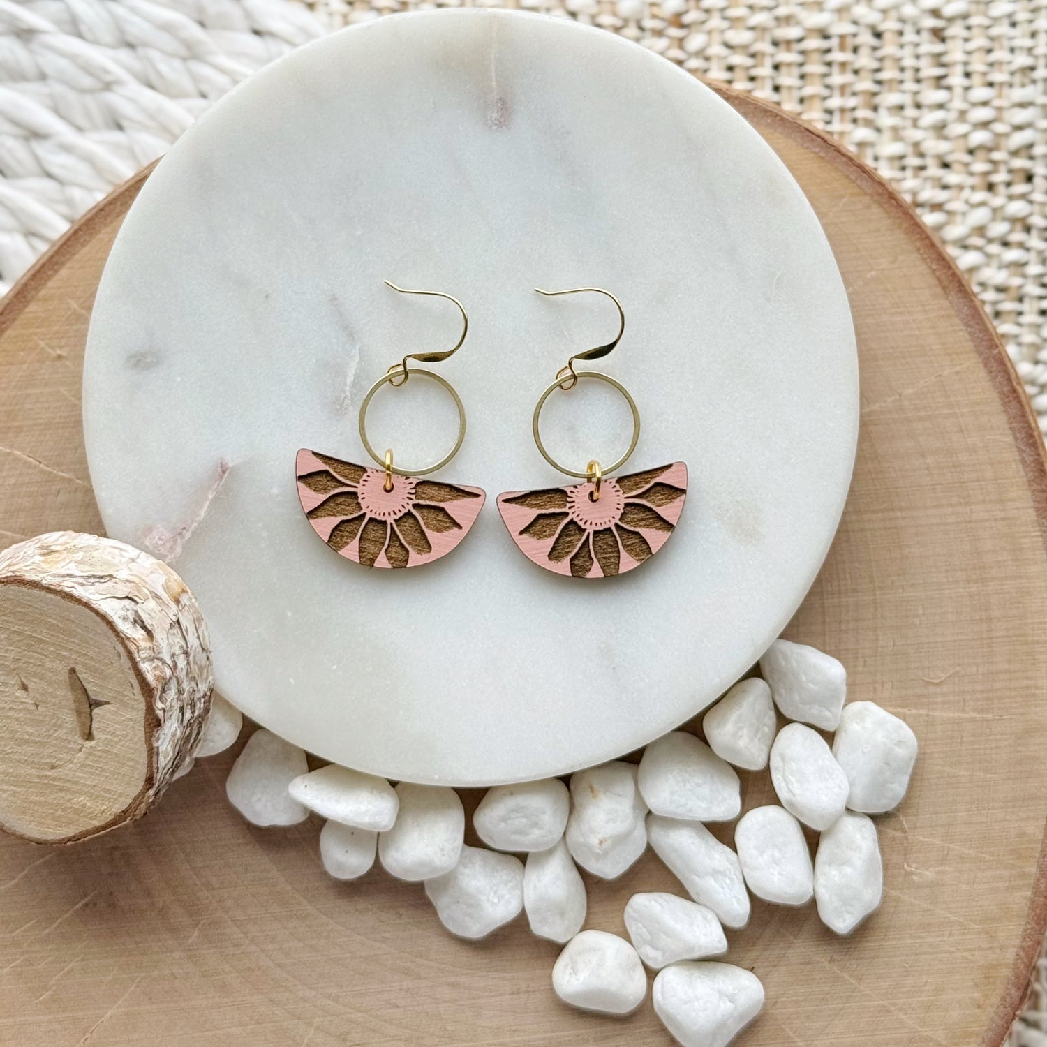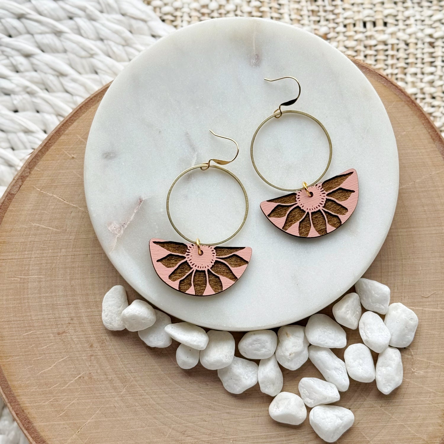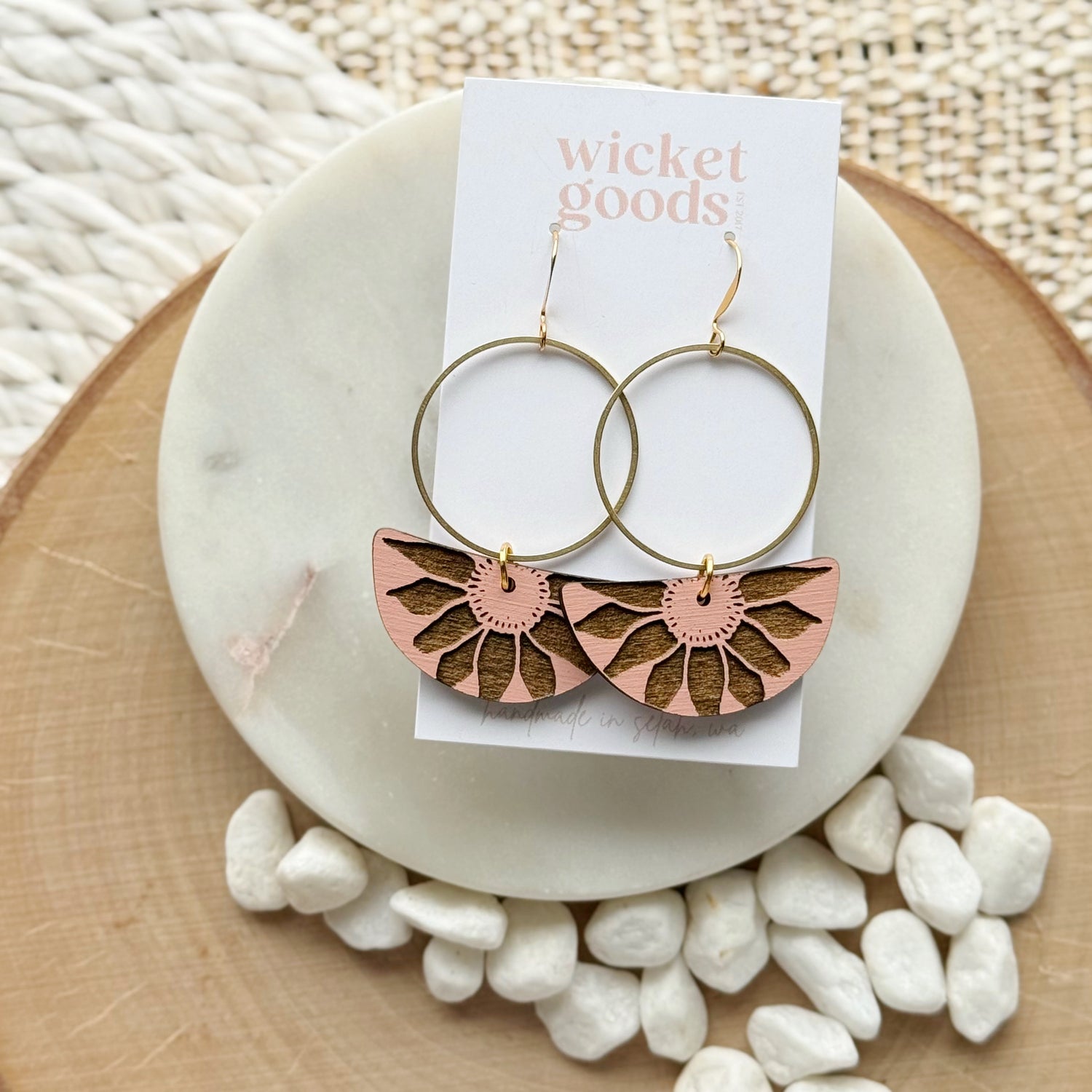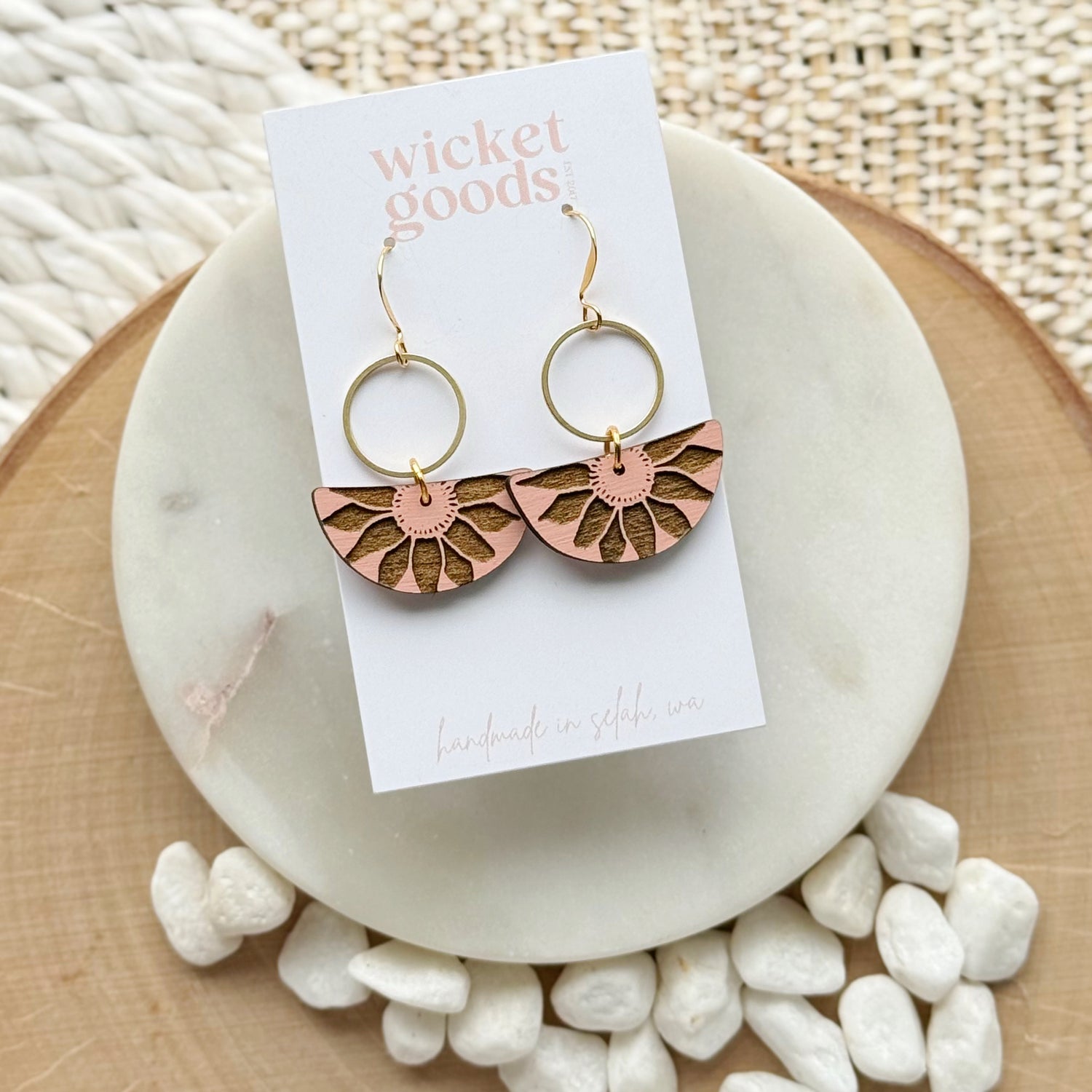 Made from hand painted basswood, raw brass, and hypoallergenic gold-plated brass ear wires. Designed, cut, and assembled in our home studio in Selah, WA.