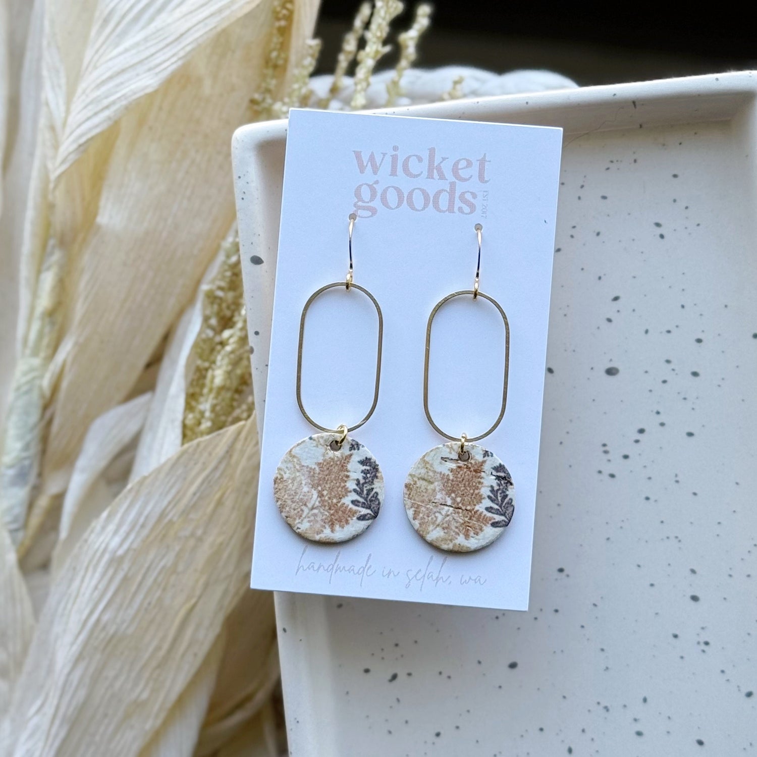 Made from cork backed with genuine leather, raw brass, and hypoallergenic gold-plated brass ear wires. Designed and assembled in our home studio in Selah, Washington.