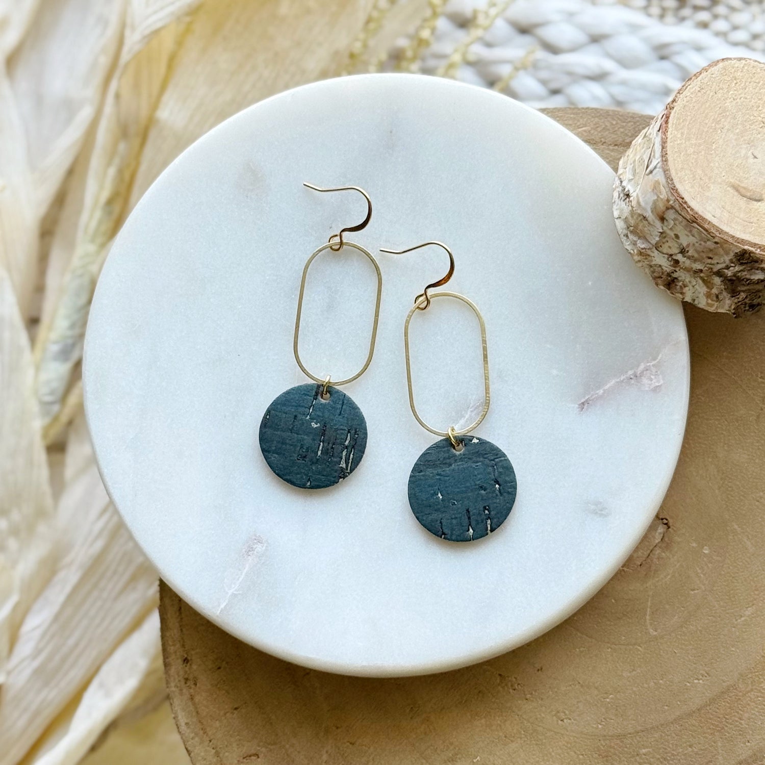 Made from cork backed with genuine leather, raw brass, and hypoallergenic gold-plated brass ear wires. Designed and assembled in our home studio in Selah, Washington.