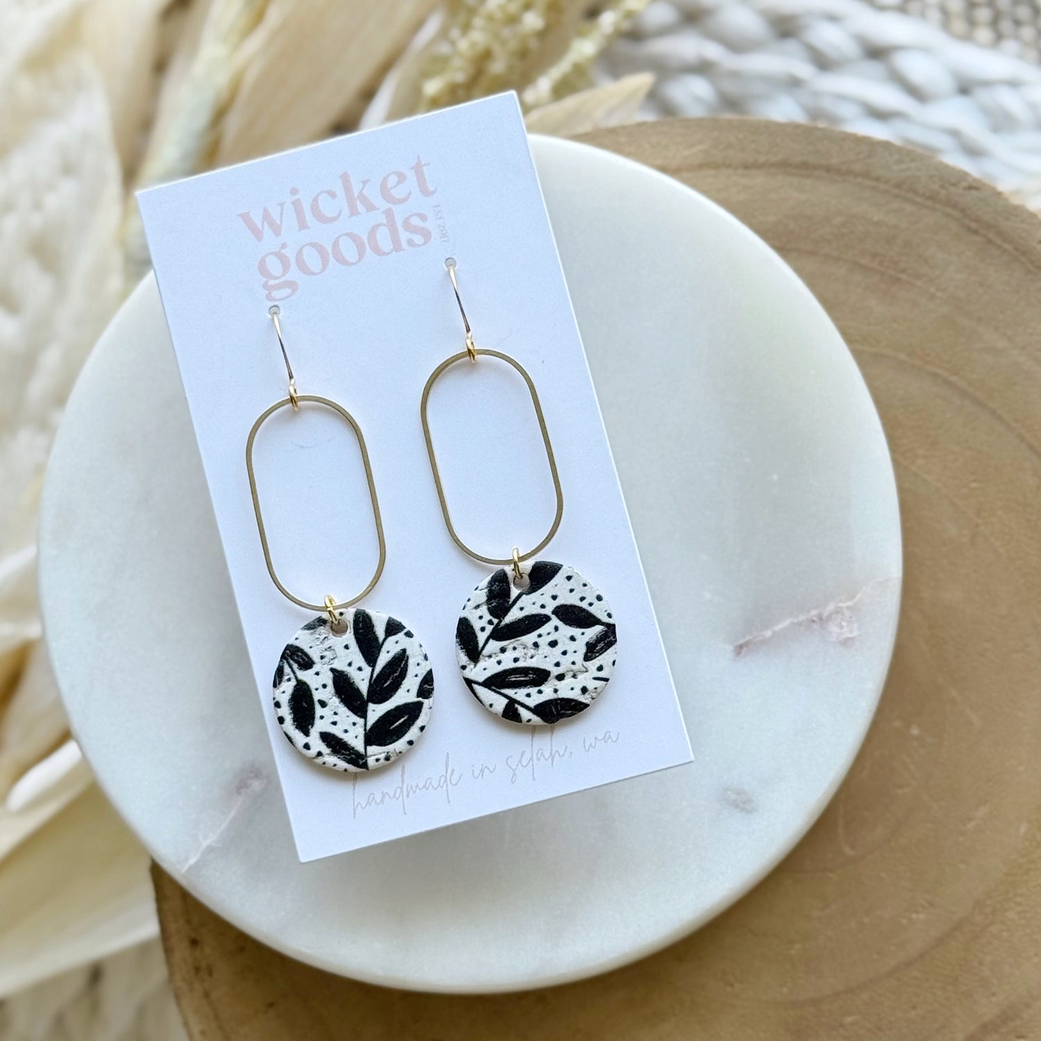 Made from cork backed with genuine leather, raw brass, and hypoallergenic gold-plated brass ear wires. Designed and assembled in our home studio in Selah, Washington.