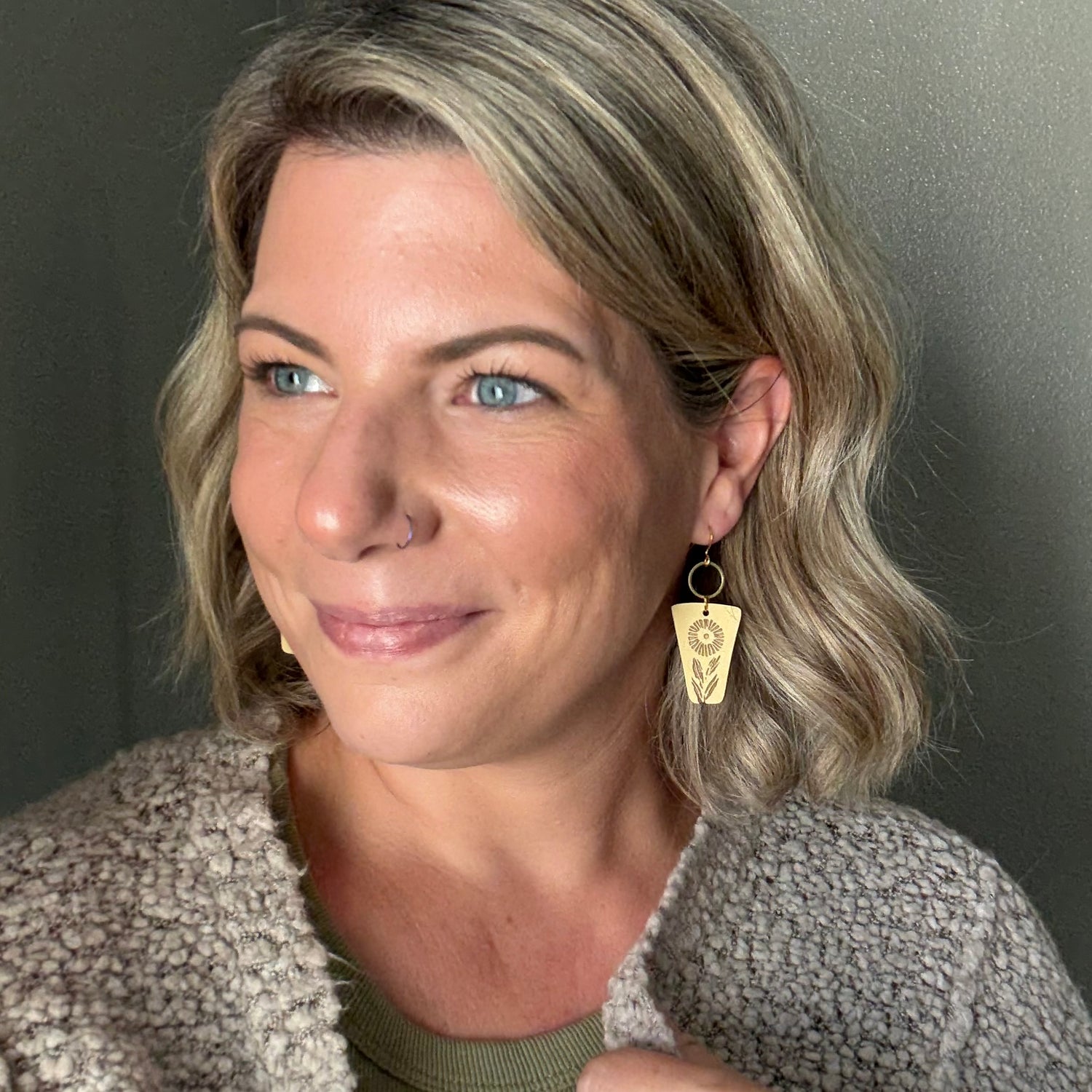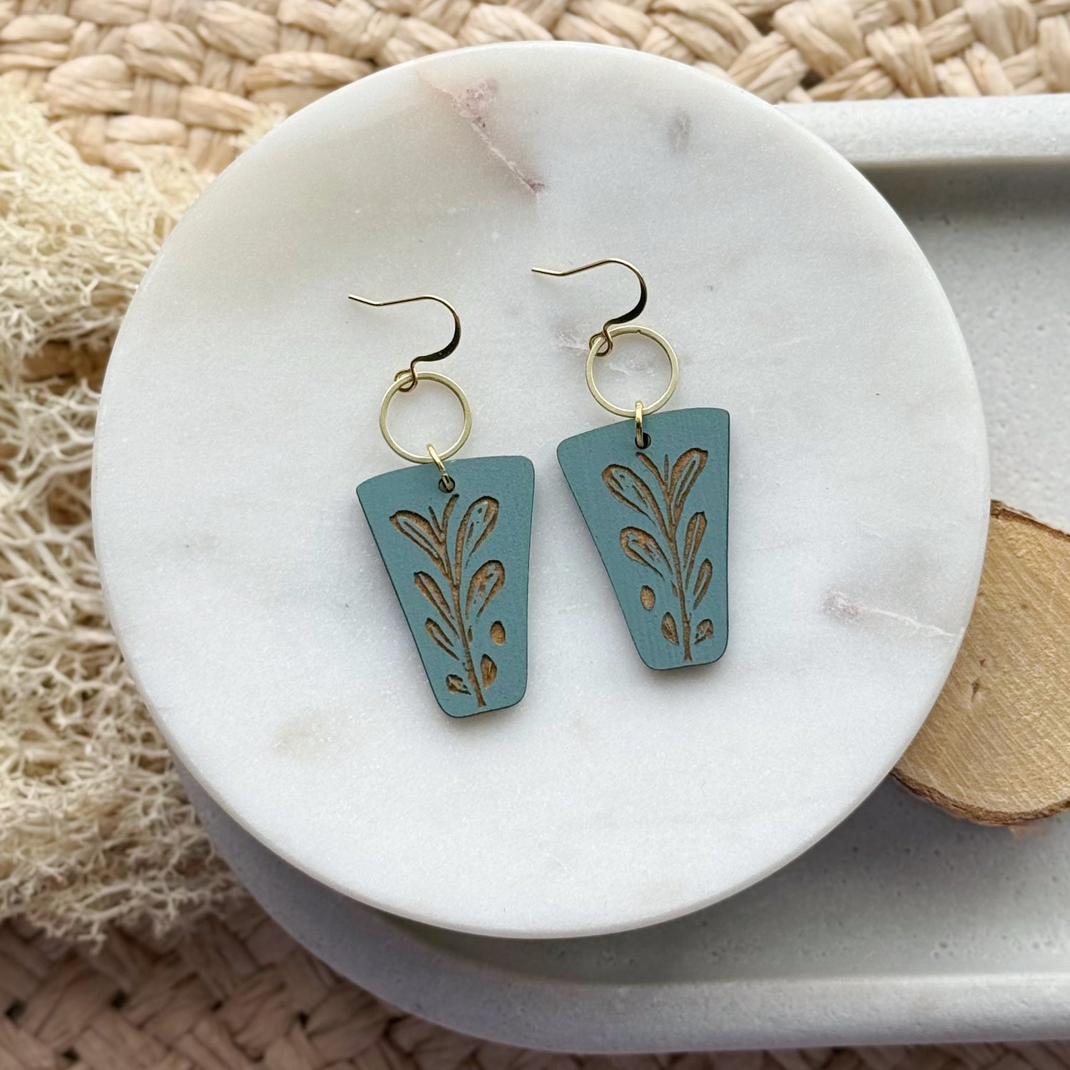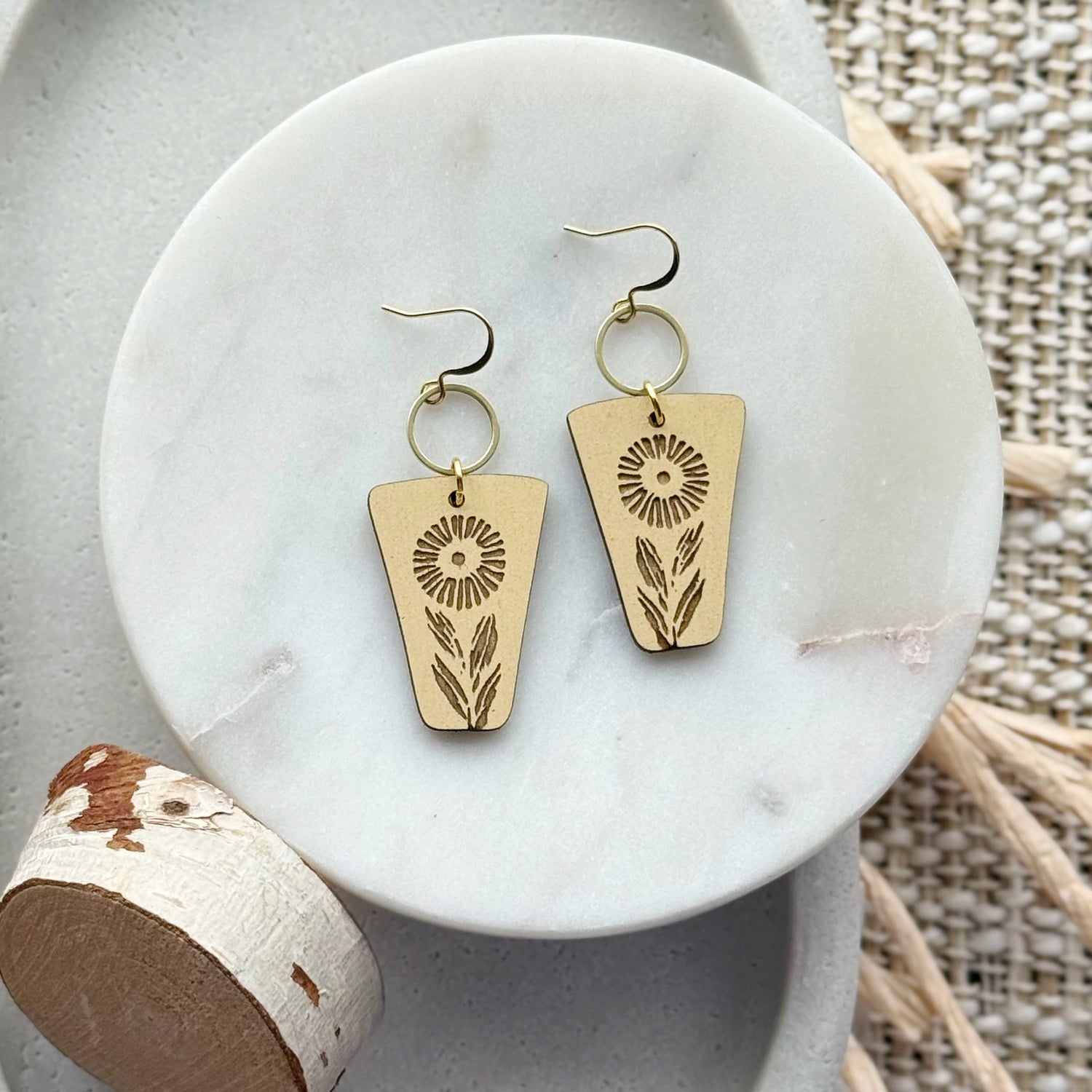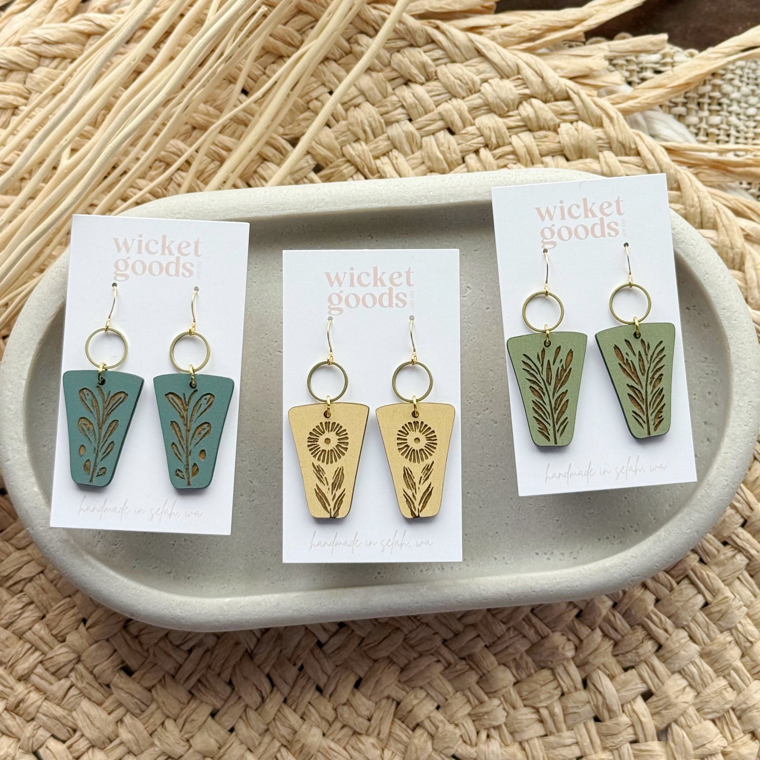 Made from hand painted Baltic Birch wood, raw brass, and hypoallergenic gold-plated brass ear wires. Designed, cut, and assembled in our home studio in Selah, Washington.