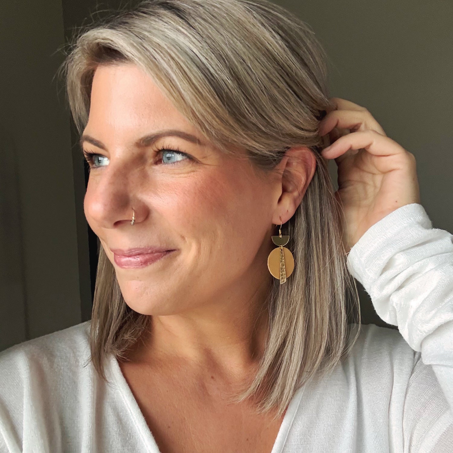 Made from genuine leather, raw brass, and hypoallergenic gold-plated brass ear wires. Designed, cut, and assembled in our home studio in Selah, WA.