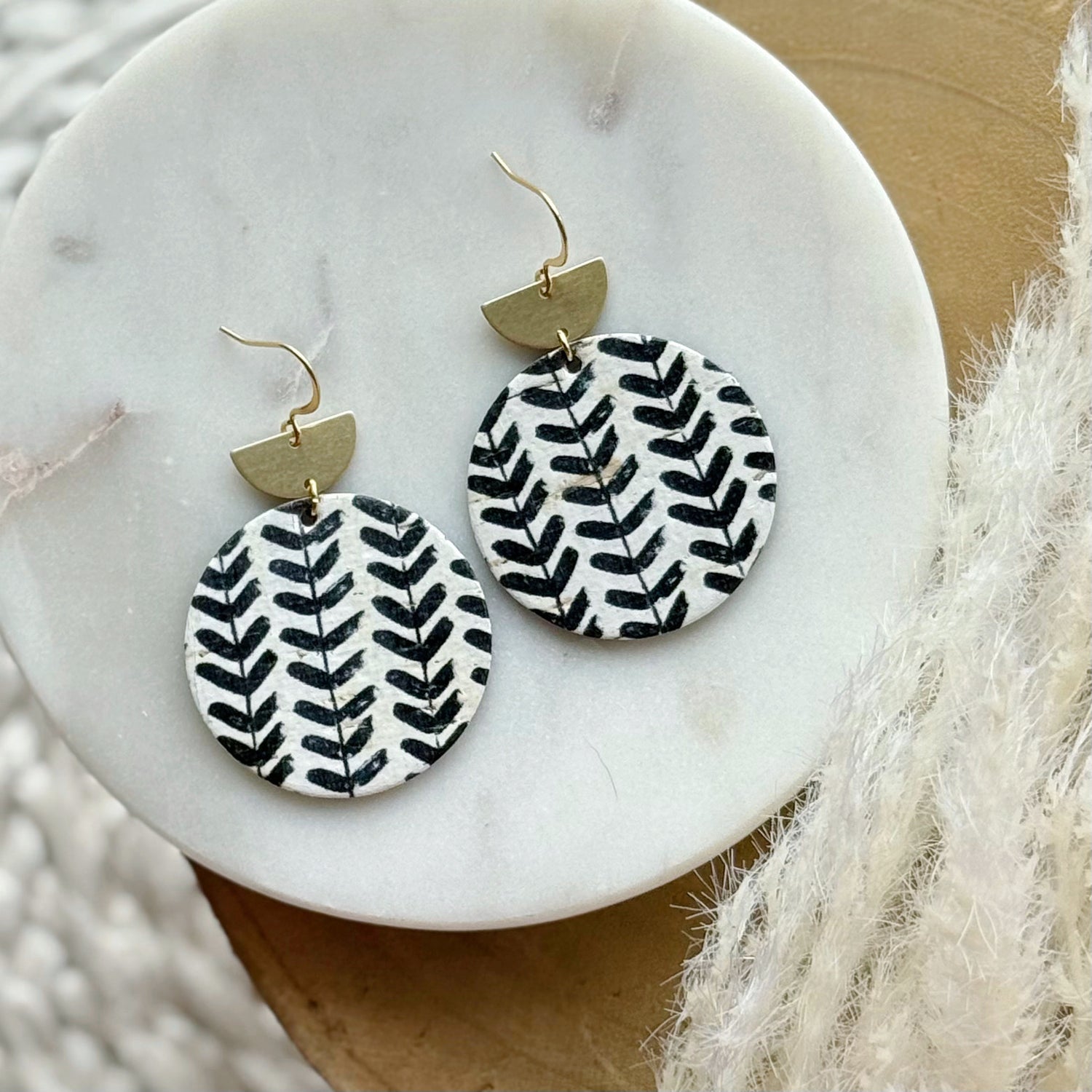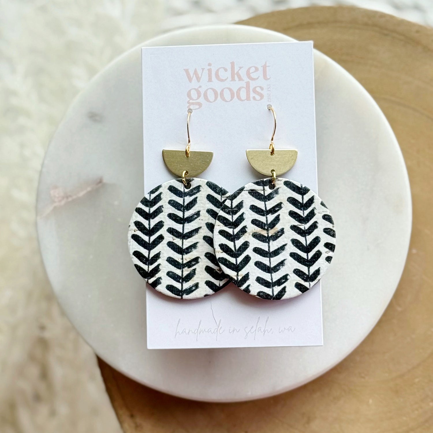 Made from cork backed with genuine leather, raw brass, and hypoallergenic gold-plated brass ear wires. Designed and assembled in our home studio in Selah, Washington.