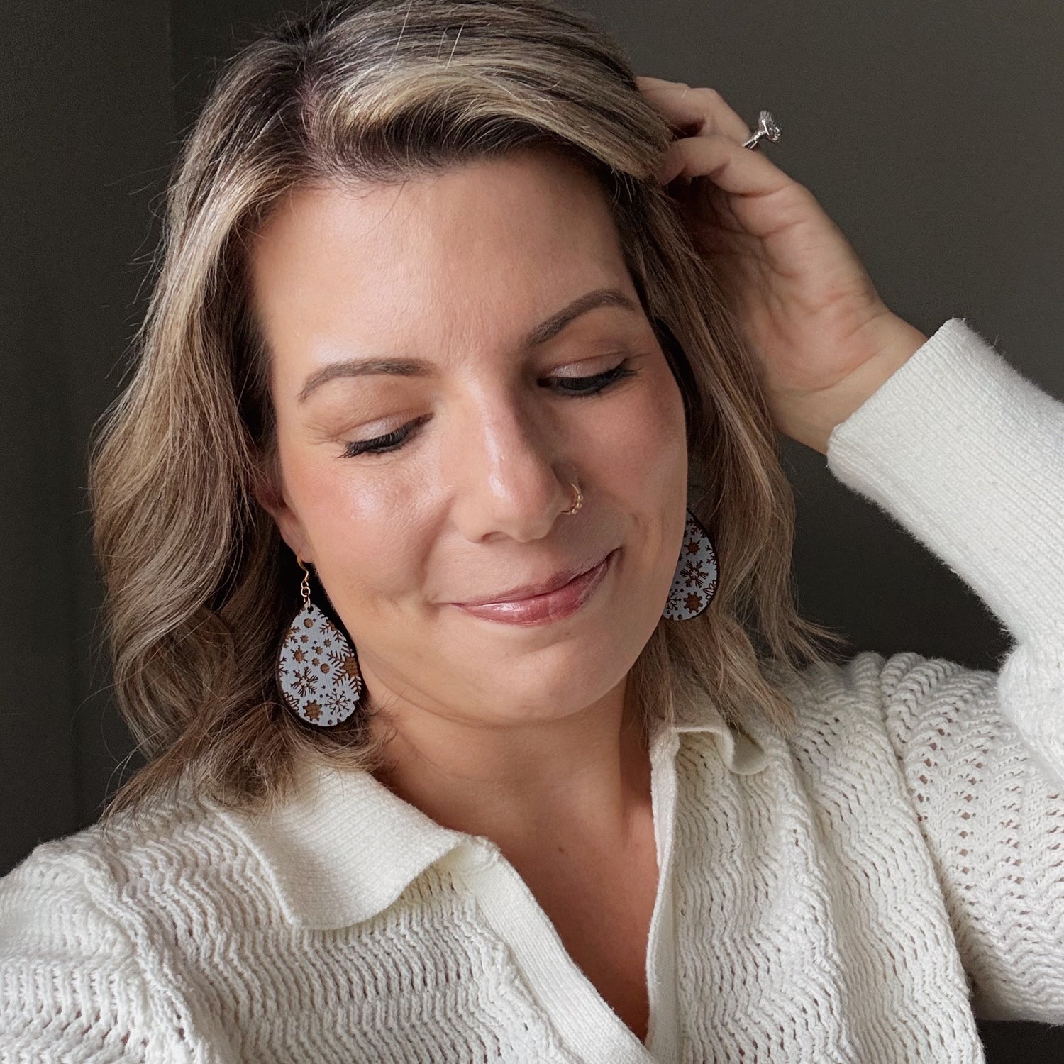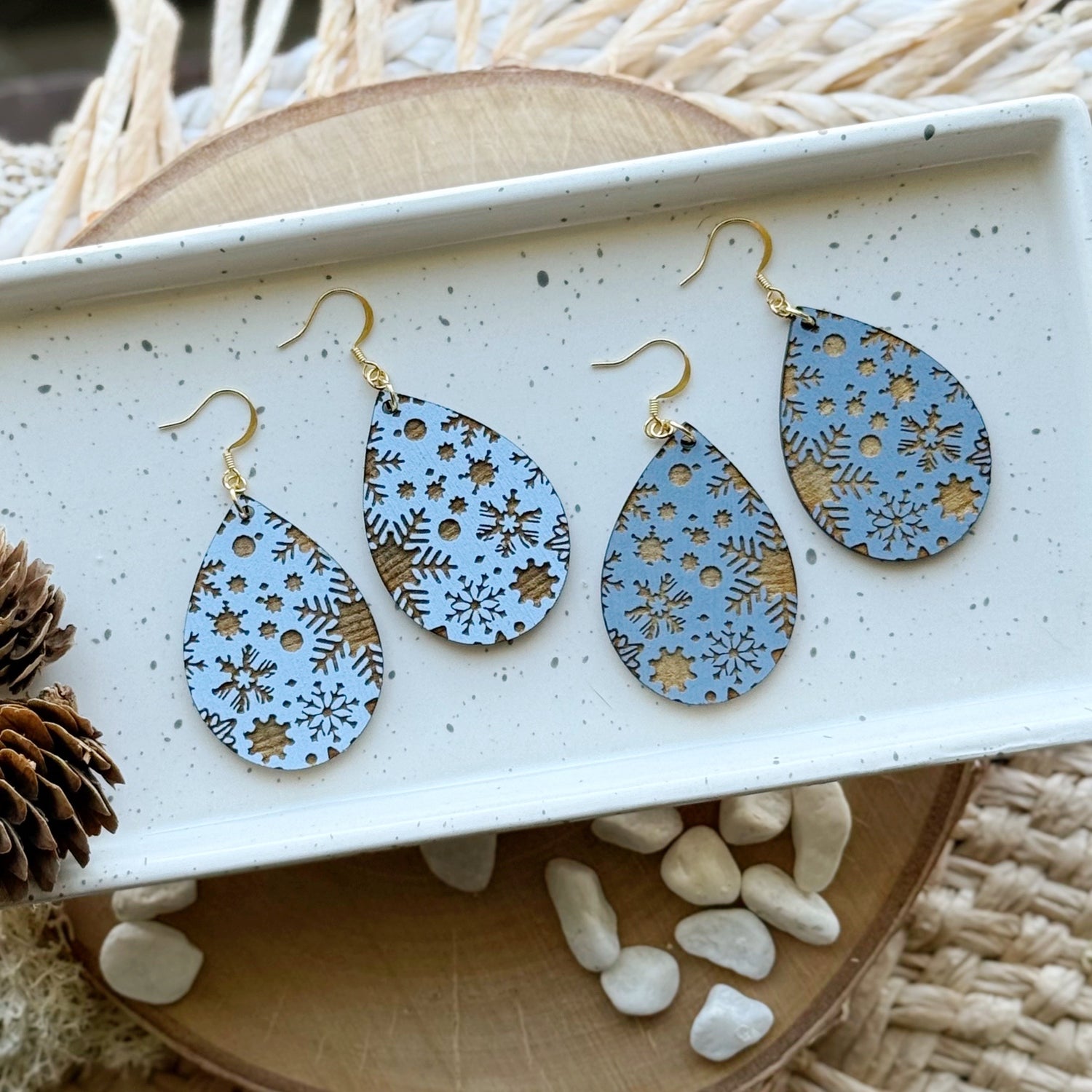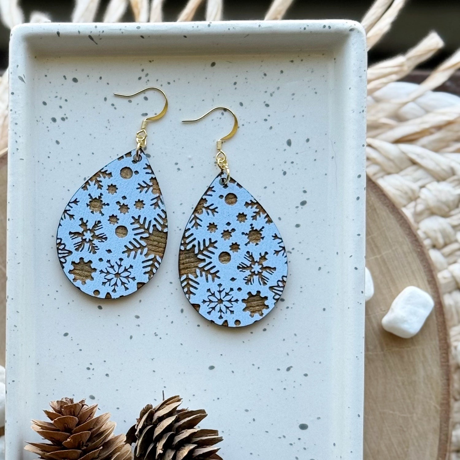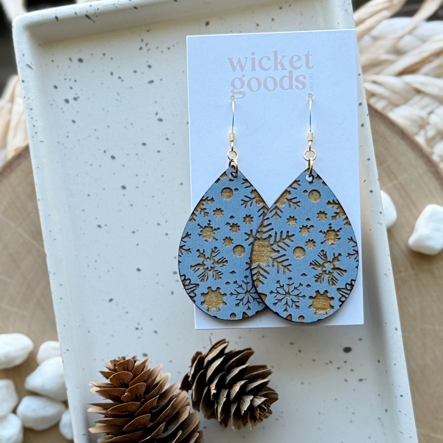 Made from hand painted basswood and hypoallergenic gold-plated brass ear wires. Designed, cut, and assembled in our home studio in Selah, Washington.