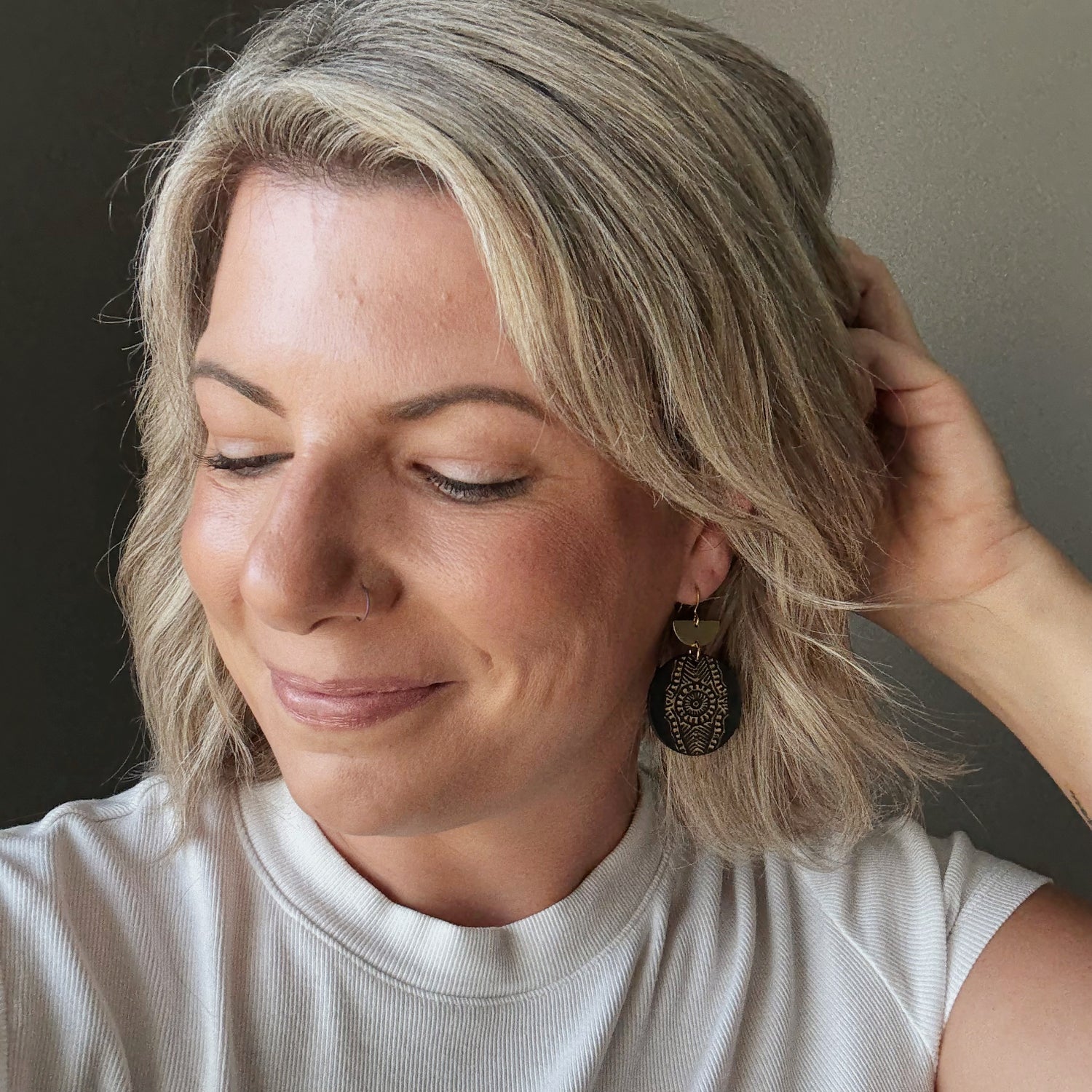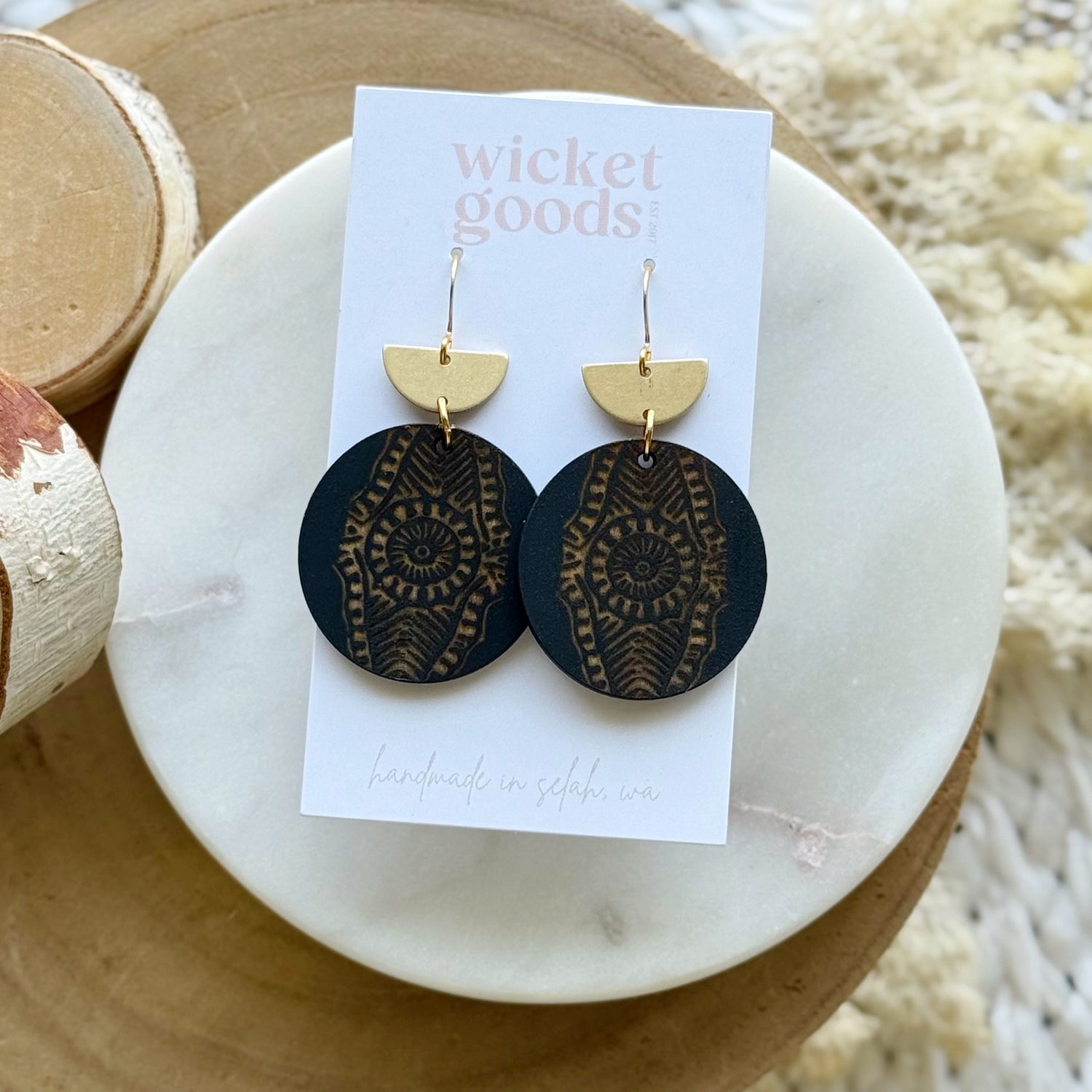 Made from hand painted Baltic birch, raw brass, and hypoallergenic gold plated brass ear wires. Designed, cut, and assembled in our home studio in Selah, Washington.