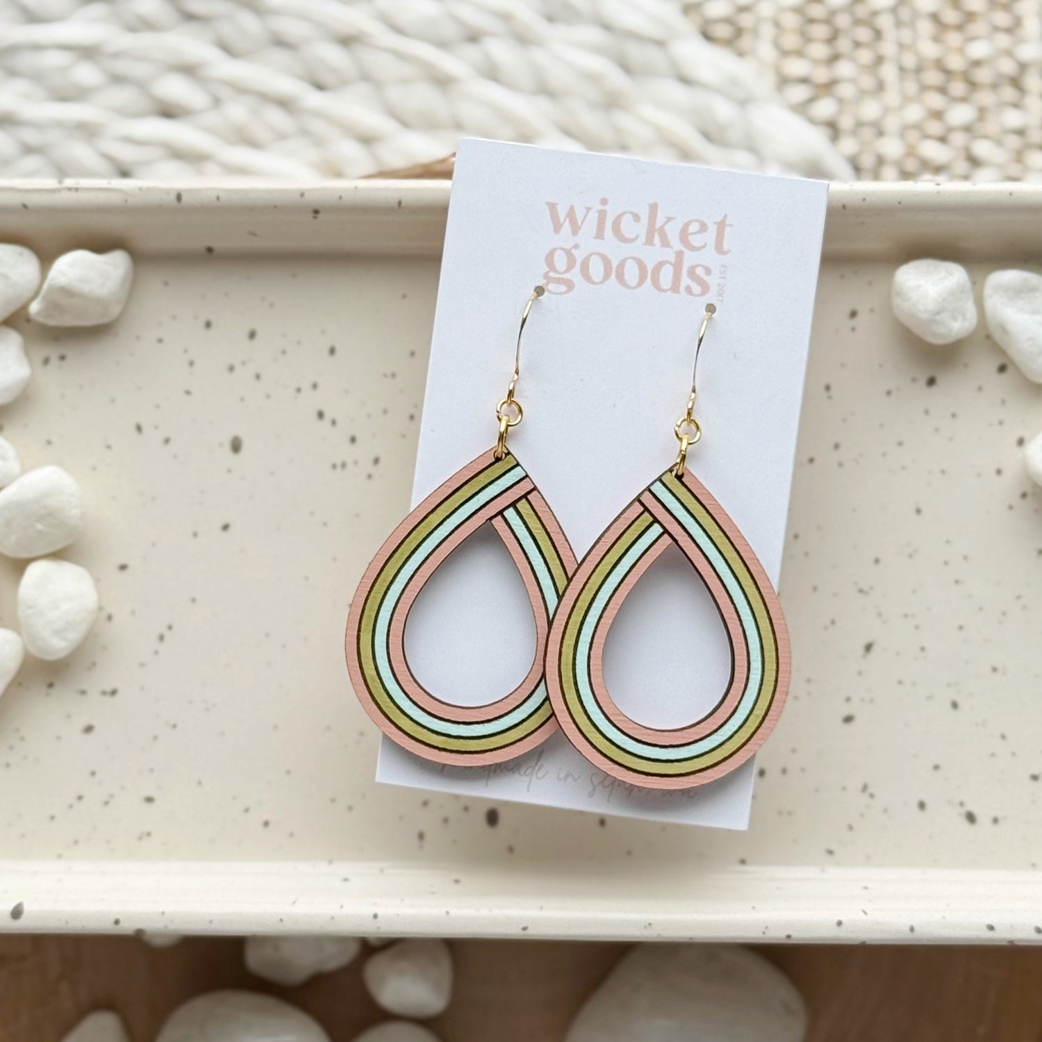 Made from hand painted baltic birch and hypoallergenic gold plated brass ear wires. Designed, cut, and assembled in our home studio in Selah, Washington.
