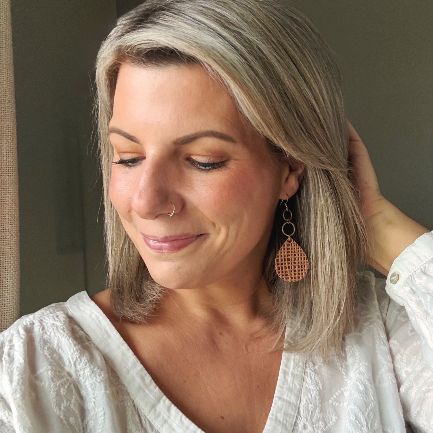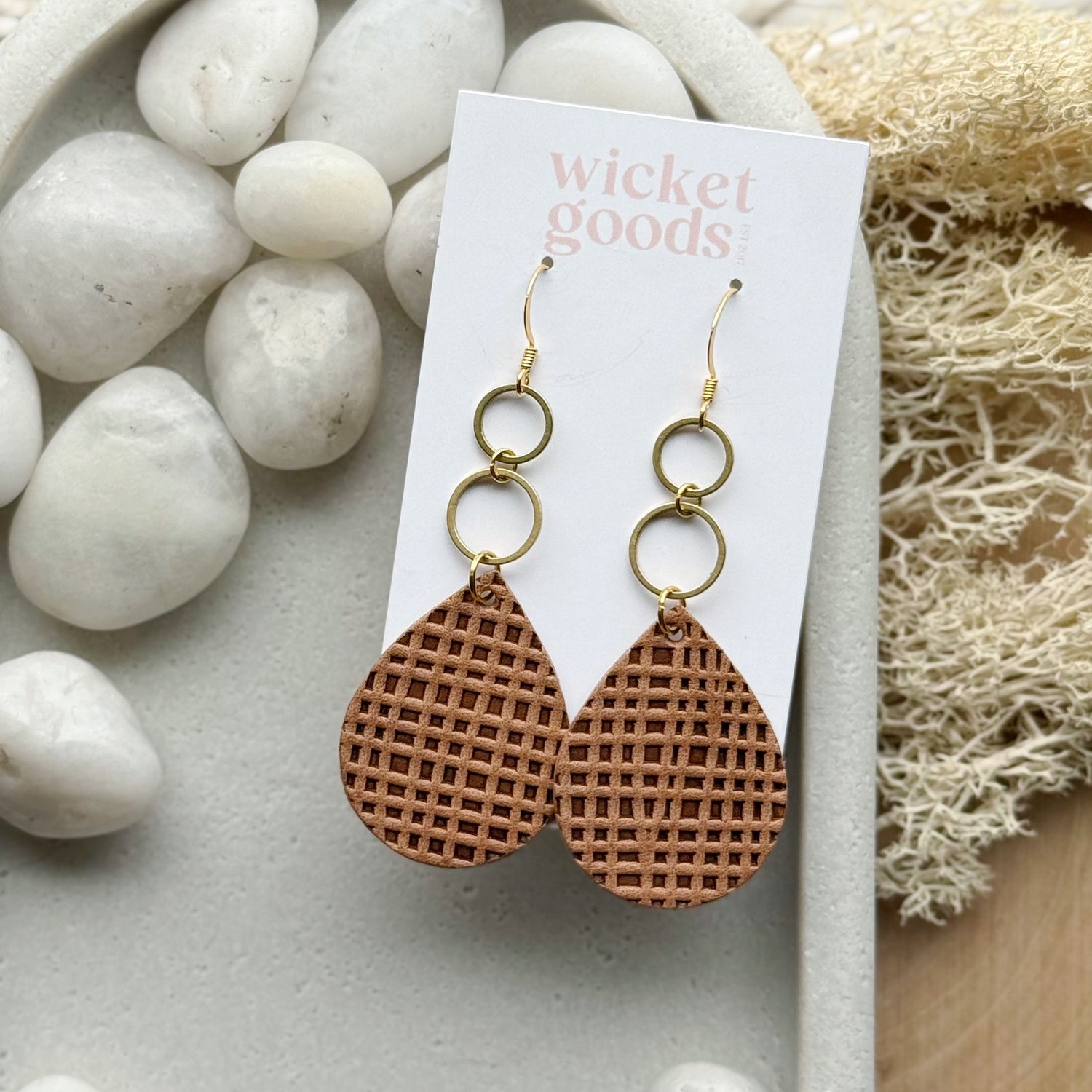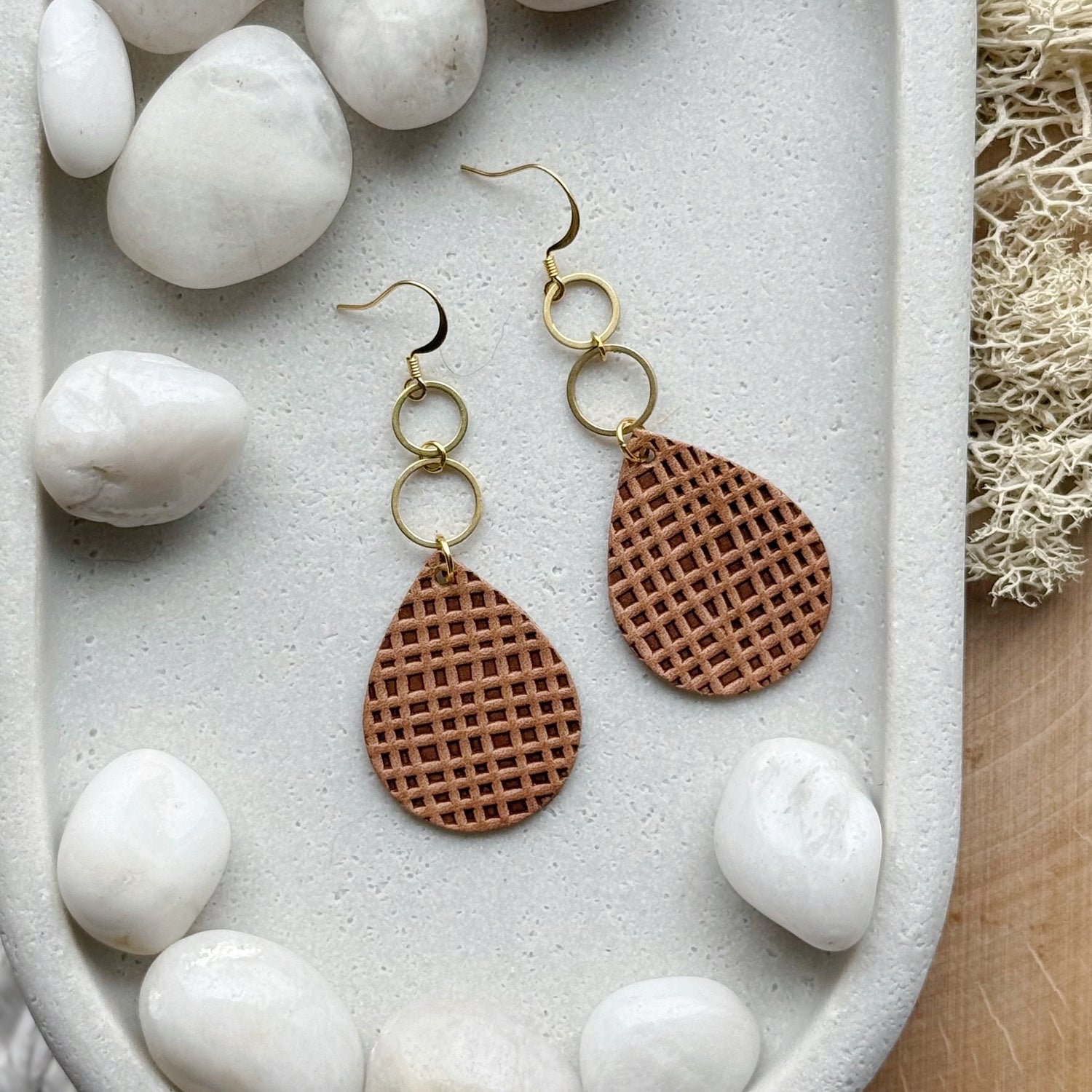 Made from genuine leather, raw brass, and hypoallergenic gold plated brass ear wires. Designed, cut, and assembled in our home studio in Selah, Washington.
