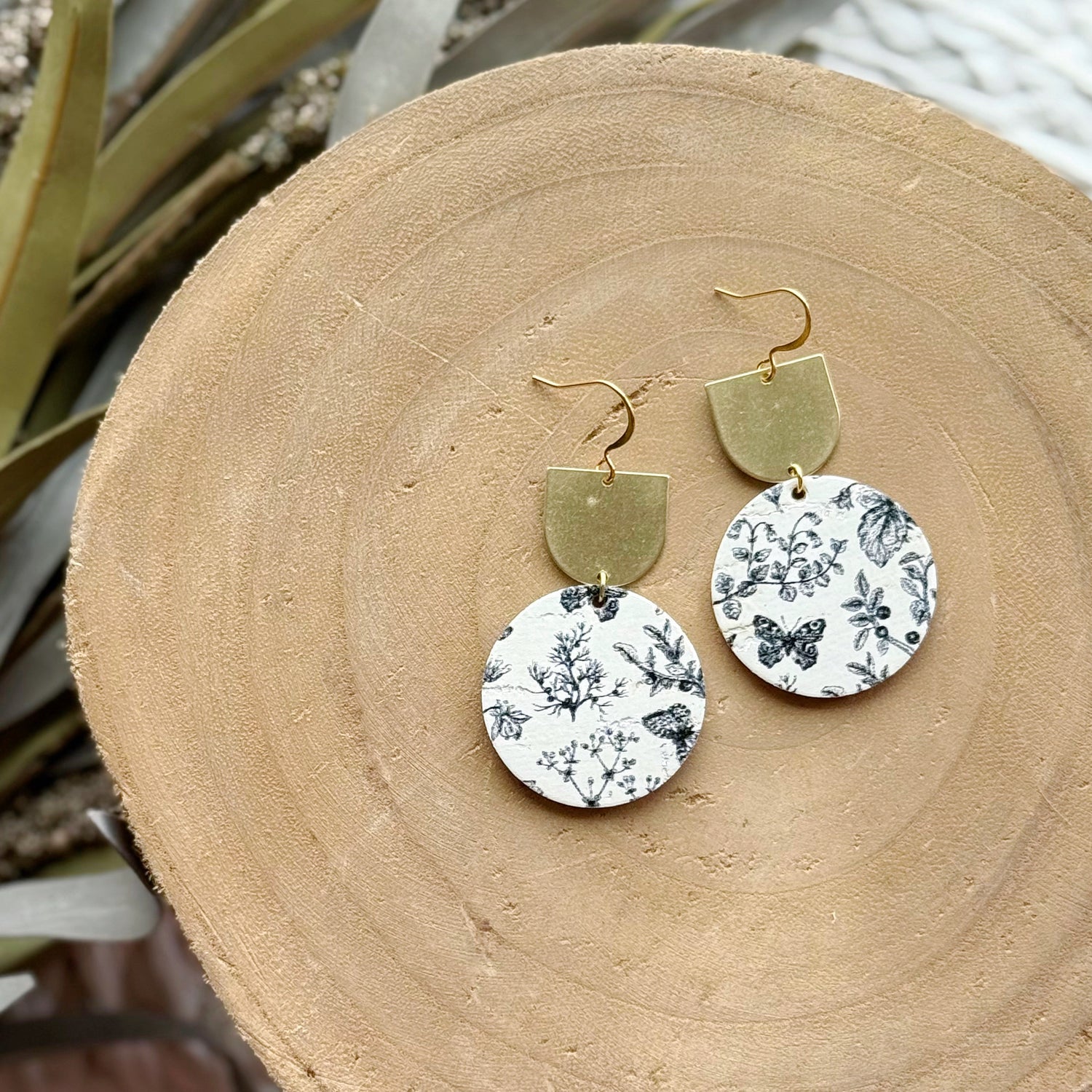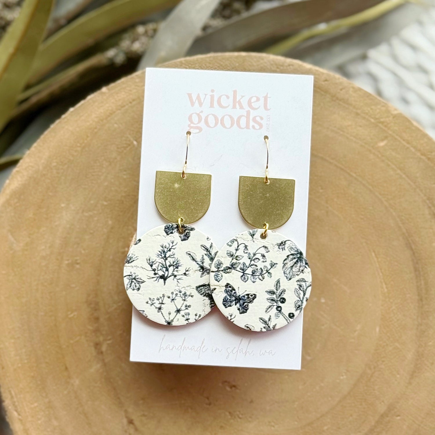 Made from cork backed with genuine leather, raw brass, and hypoallergenic gold plated brass ear wires. Designed, cut, and assembled in our home studio in Selah, Washington.