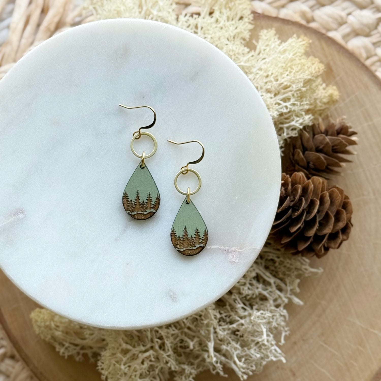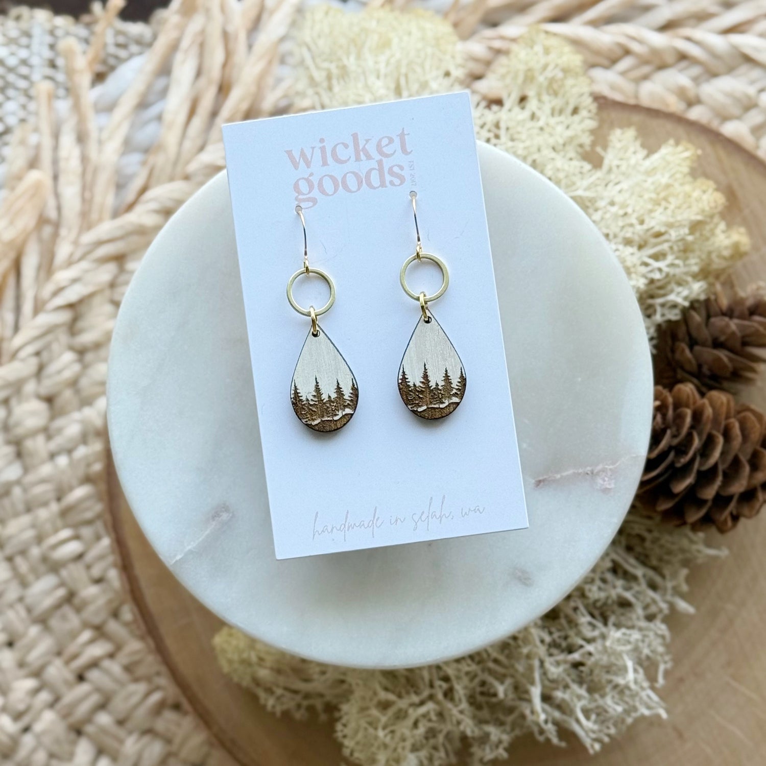 Made from hand painted Baltic Birch wood, raw brass, and hypoallergenic gold-plated brass ear wires. Designed, cut, and assembled in our home studio in Selah, Washington.