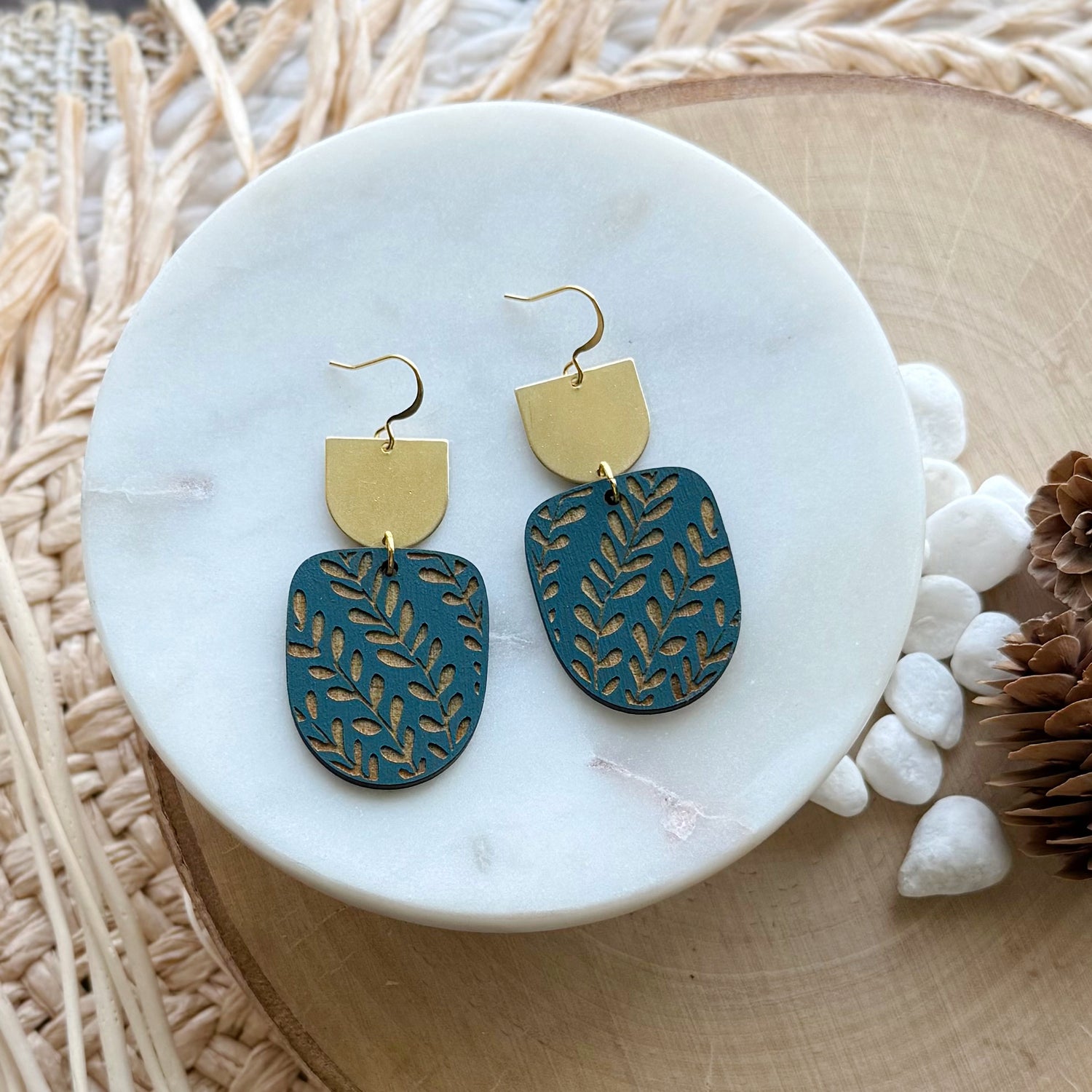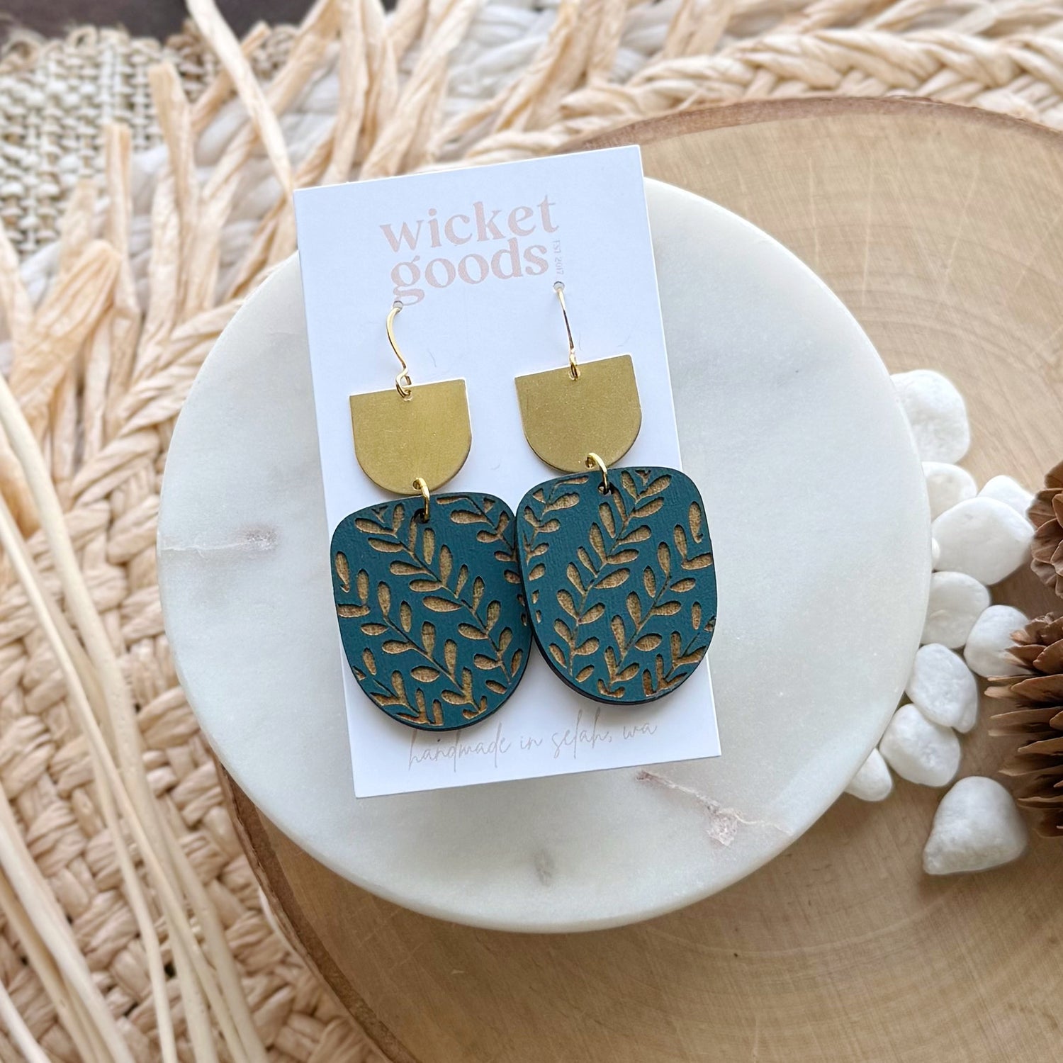 Made from hand painted Baltic birch, raw brass, and hypoallergenic gold plated brass ear wires. Designed, cut, and assembled in our home studio in Selah, Washington.