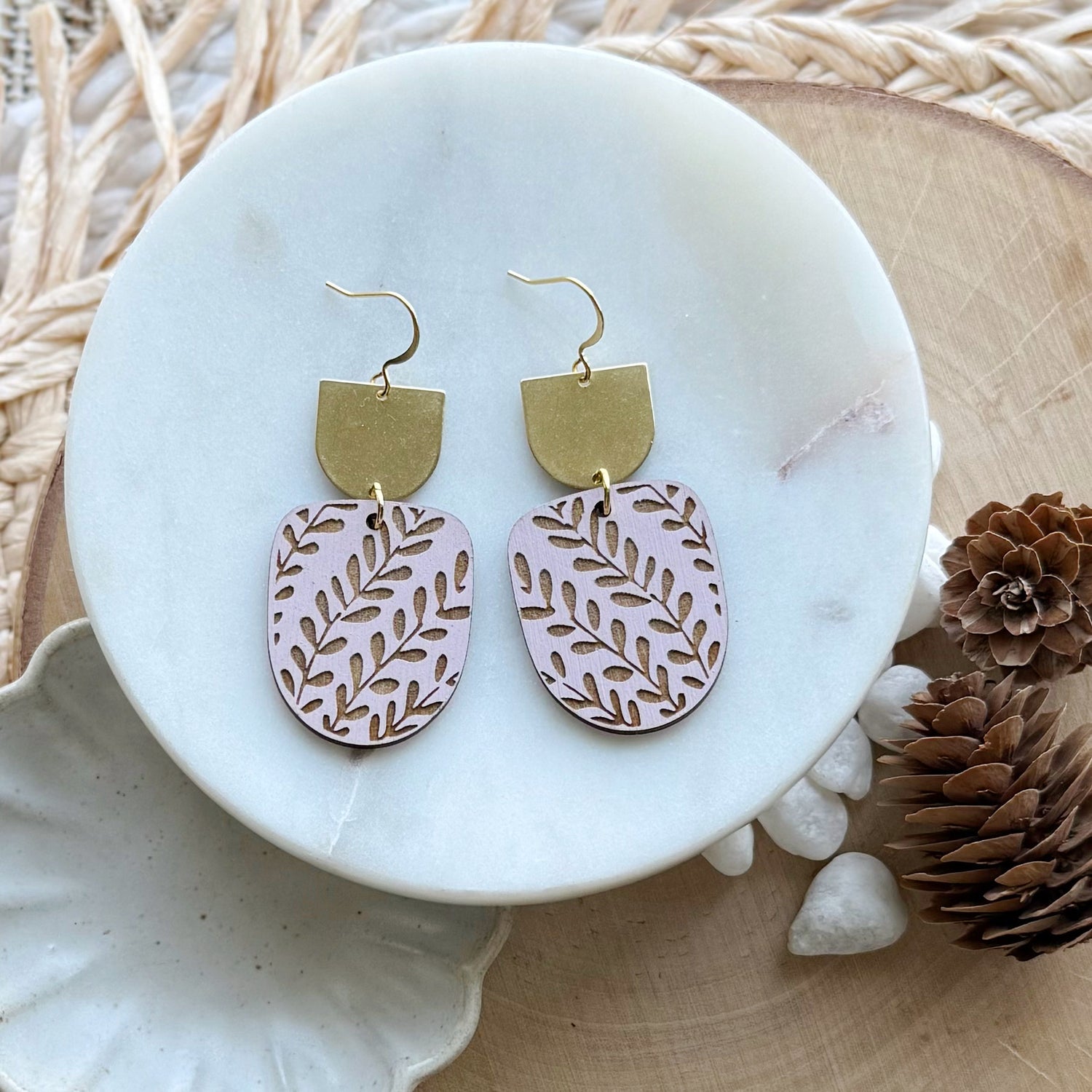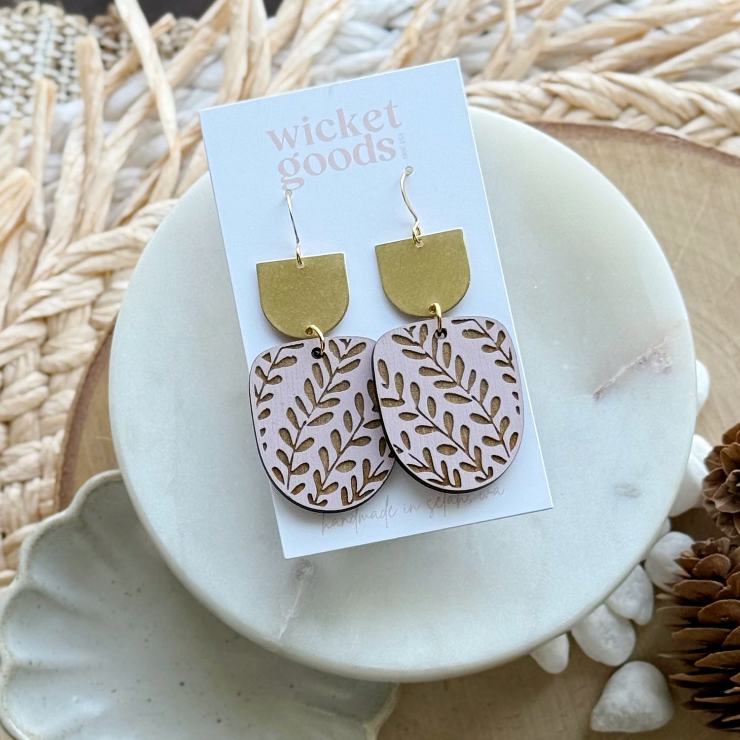 Made from hand painted Baltic birch, raw brass, and hypoallergenic gold plated brass ear wires. Designed, cut, and assembled in our home studio in Selah, Washington.