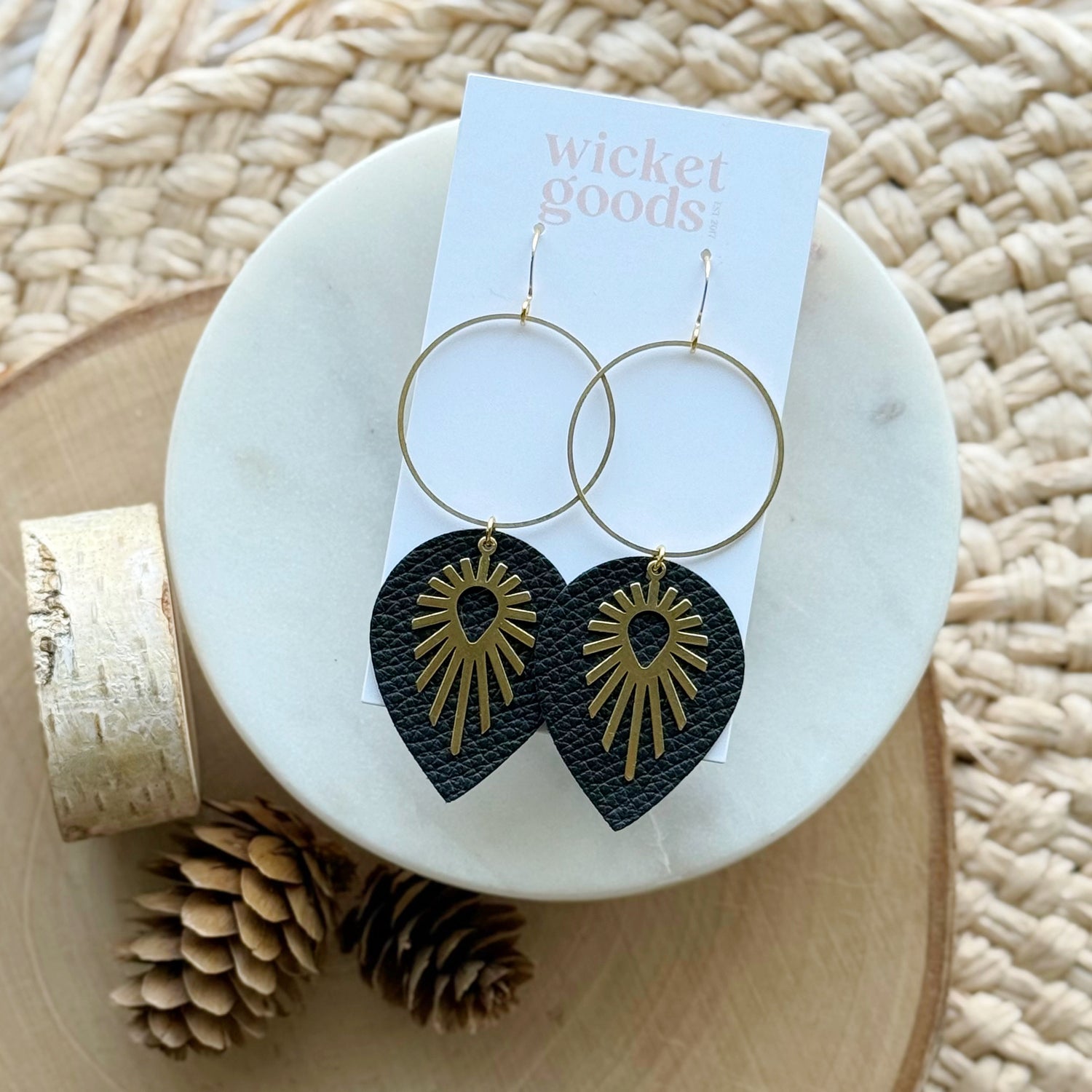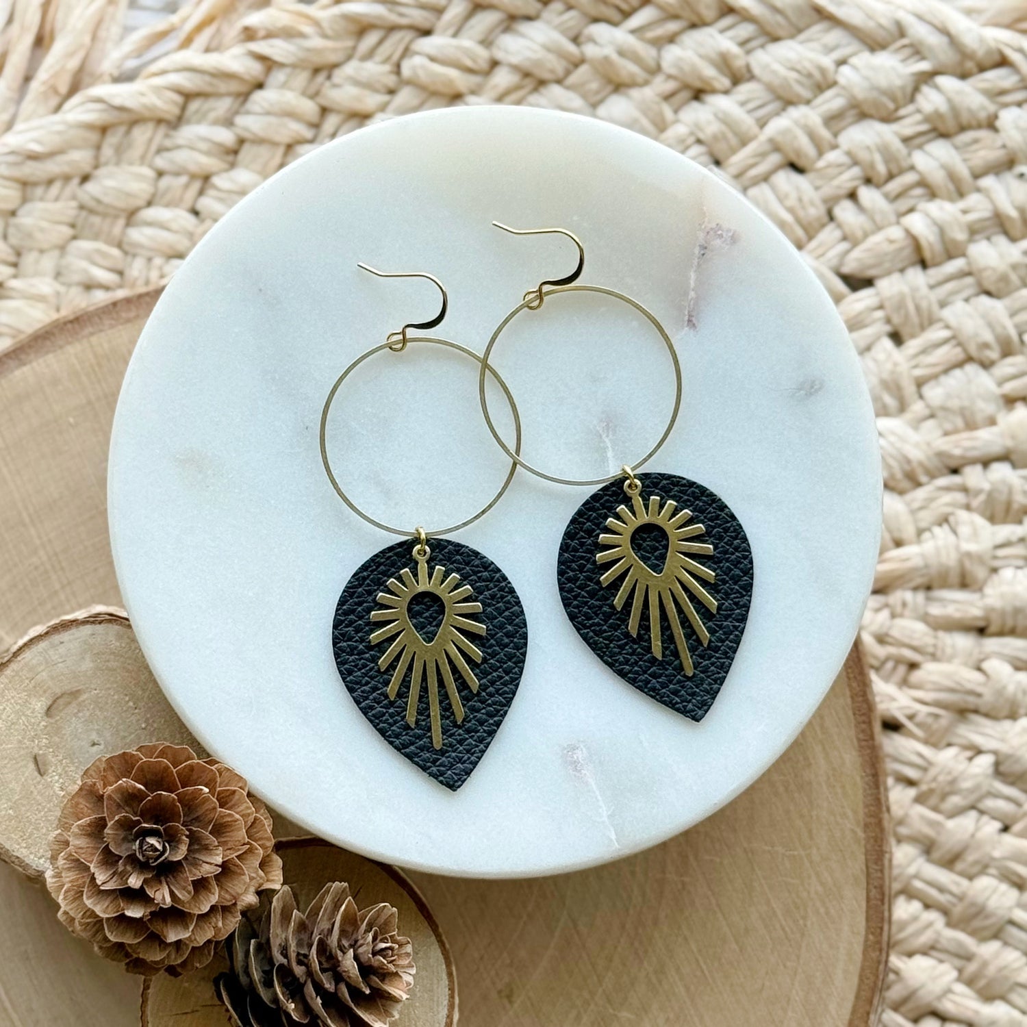 Made from genuine leather, raw brass, and hypoallergenic gold plated brass ear wires. Designed and assembled in our home studio in Selah, Washington.