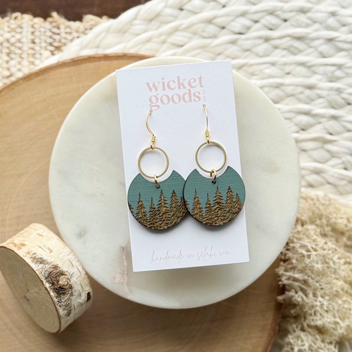 Made from hand painted baltic birch, raw brass, and hypoallergenic gold-plated brass ear wires. Designed, cut, and assembled in our home studio in Selah, Washington.