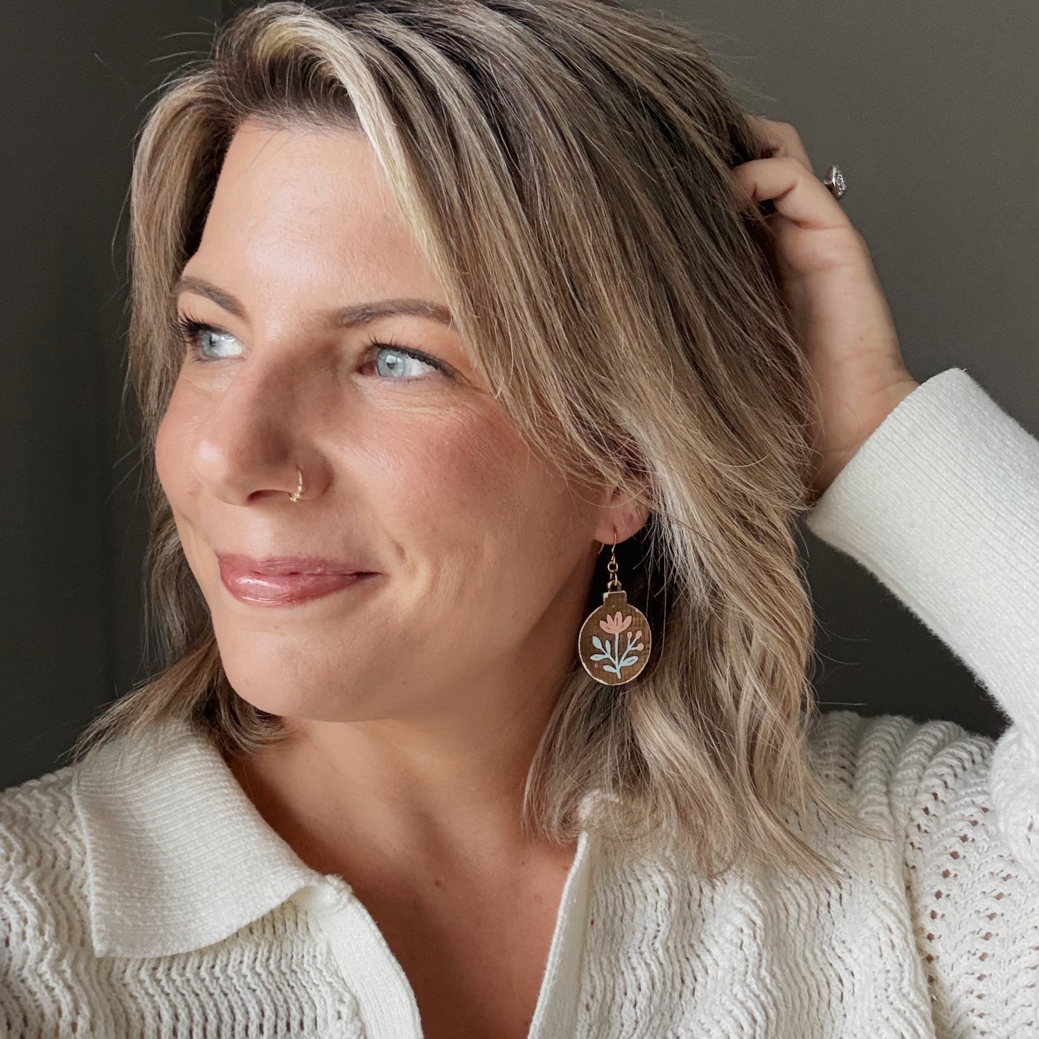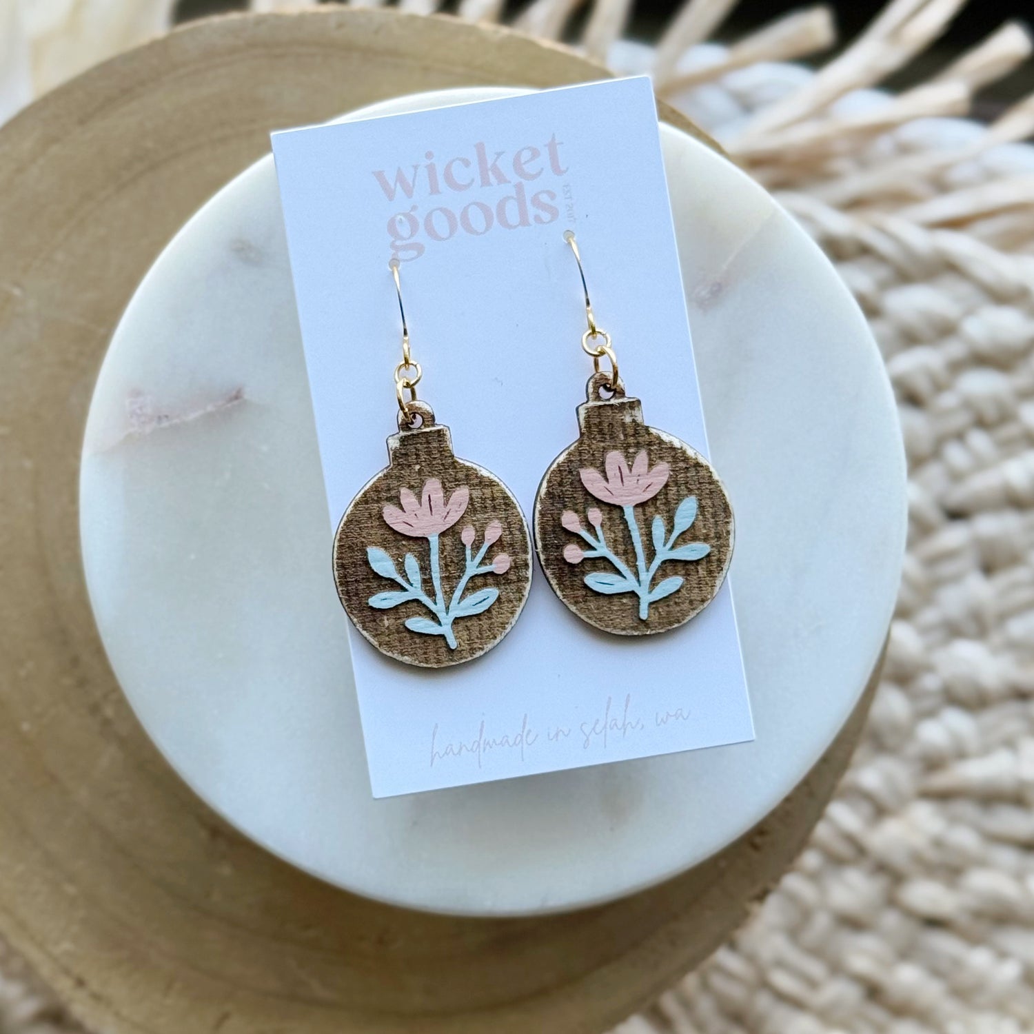 Made from hand painted basswood and hypoallergenic gold-plated brass ear wires. Designed, cut, and assembled in our home studio in Selah, Washington.